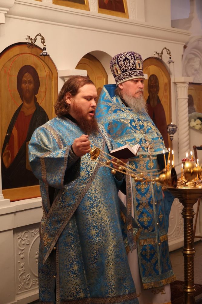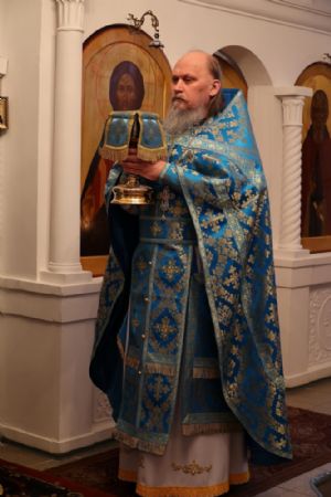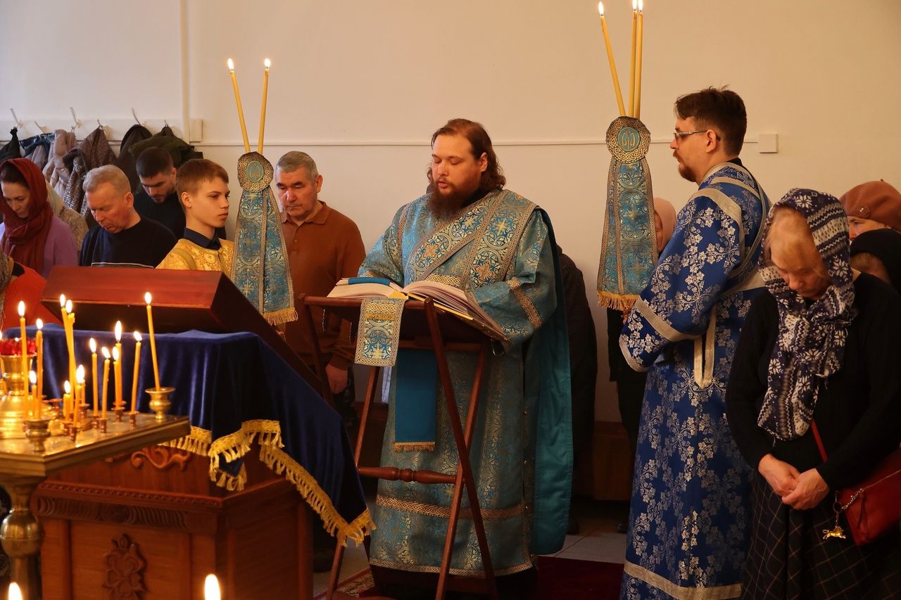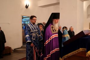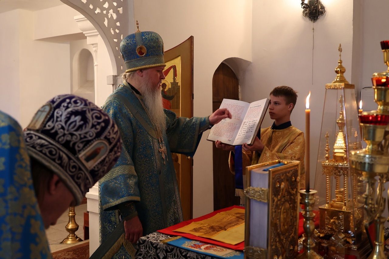 Его Преосвященству сослужили настоятель храма иконы Божией Матери «Всех скорбящих Радость» протоиерей Александр Михайлов и клирик Никольского кафедрального собора диакон Иоанн Захаров. Песнопения исполнял хор храма под управлением Ирины Канашиной.