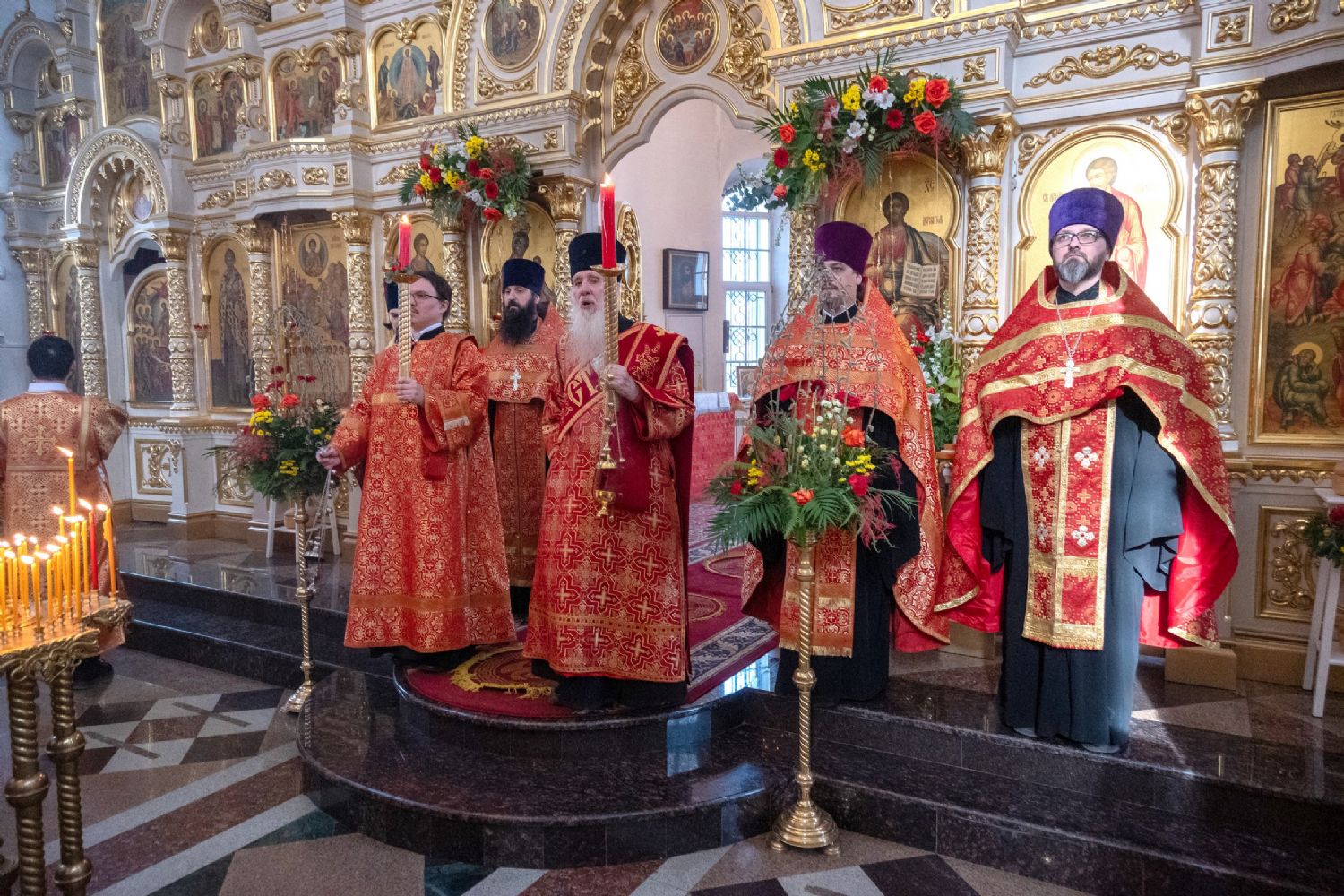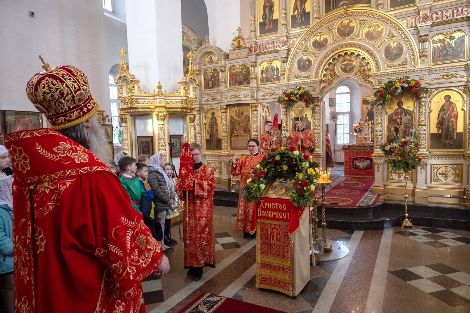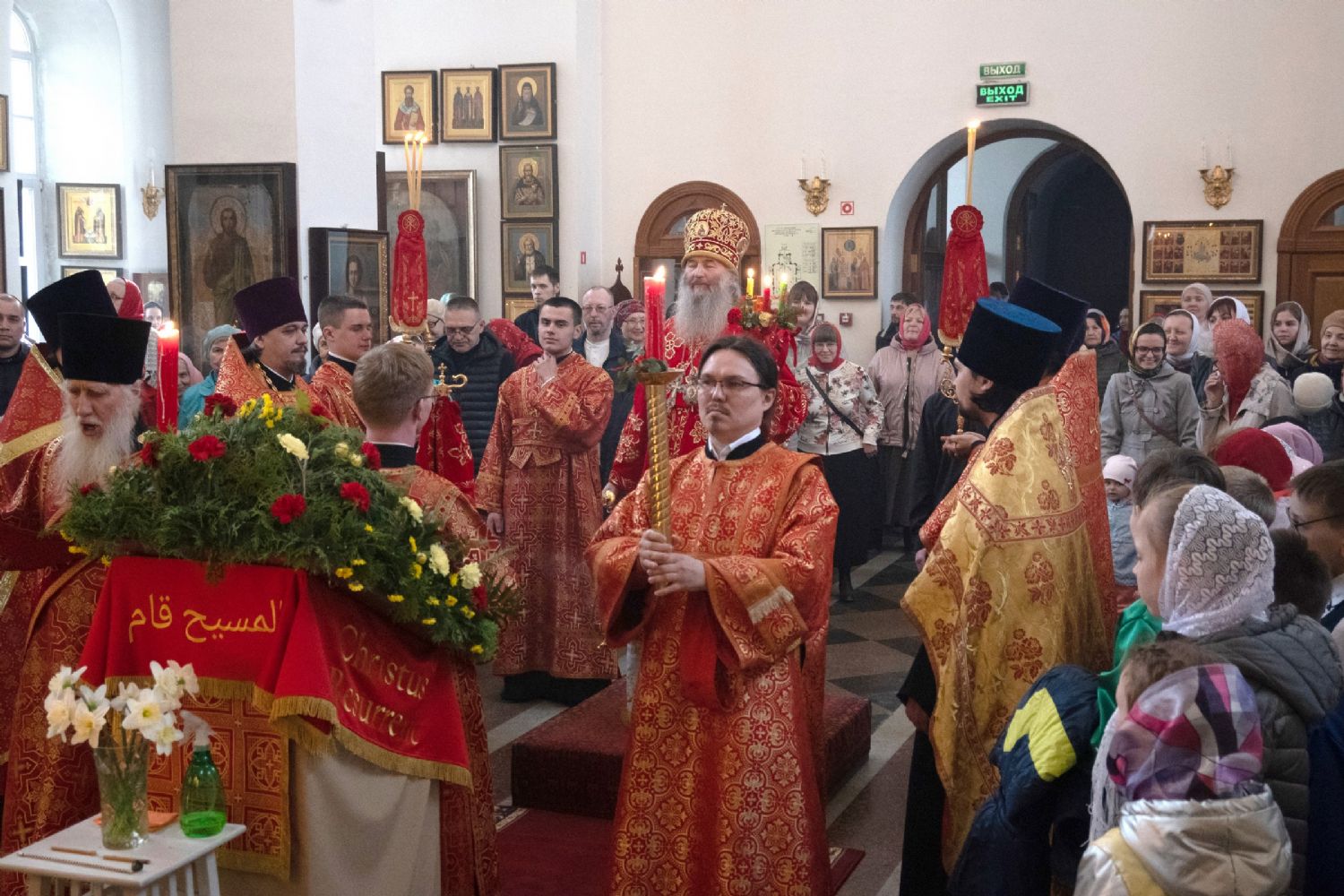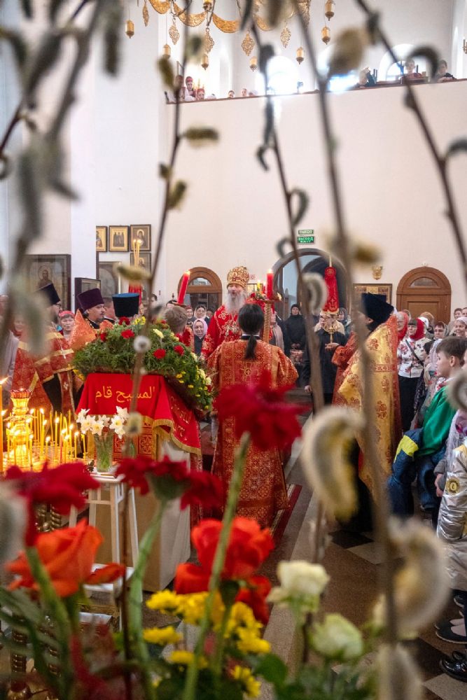 Владыке сослужили настоятель храма иерей Александр Лоскутов, клирики храма и протодиакон Михаил Козловский. Пасхальные песнопения исполняли хор храма под управлением регента Наталии Поповой и детский хор воскресной школы храма.