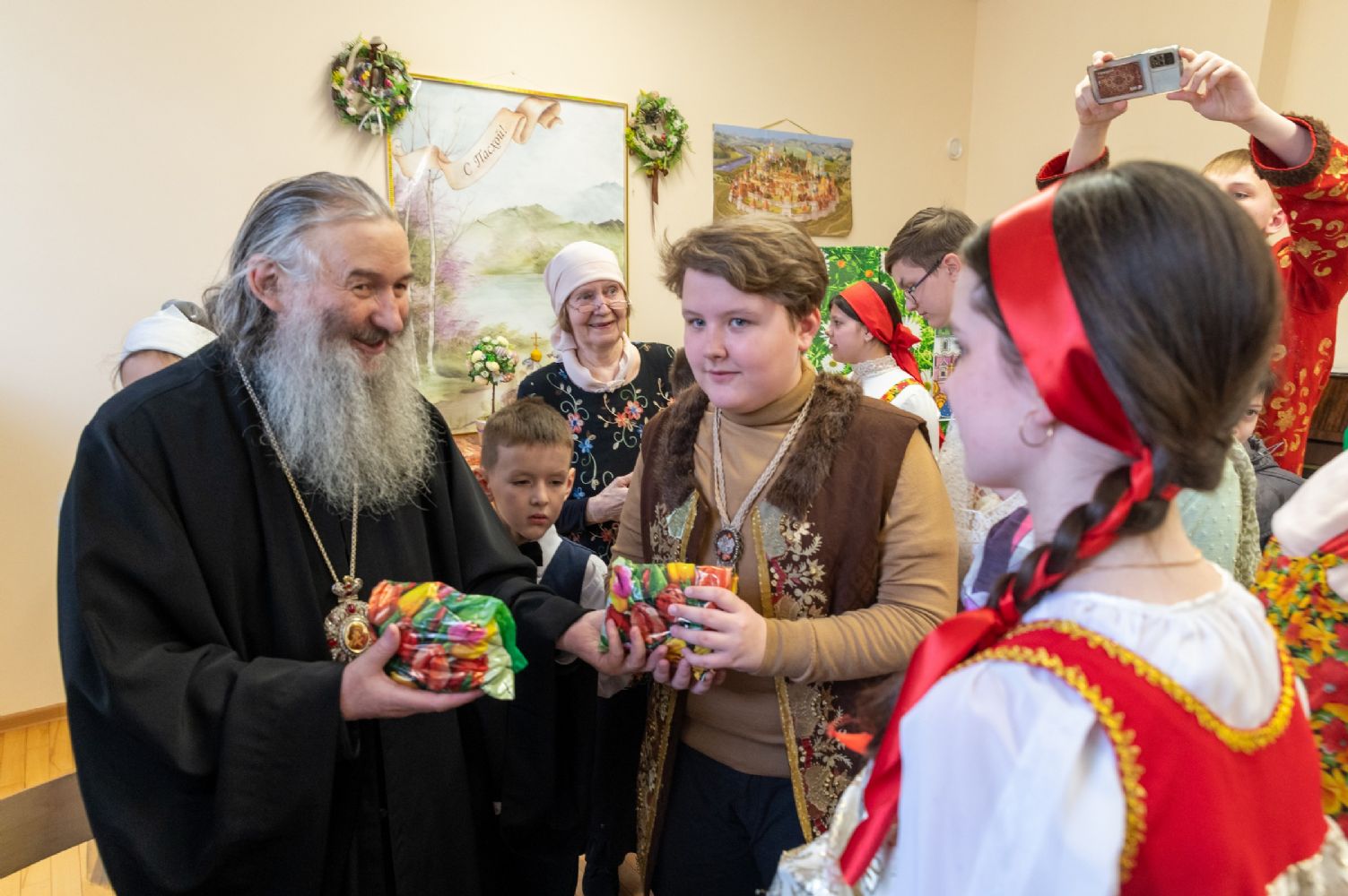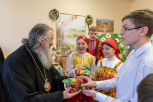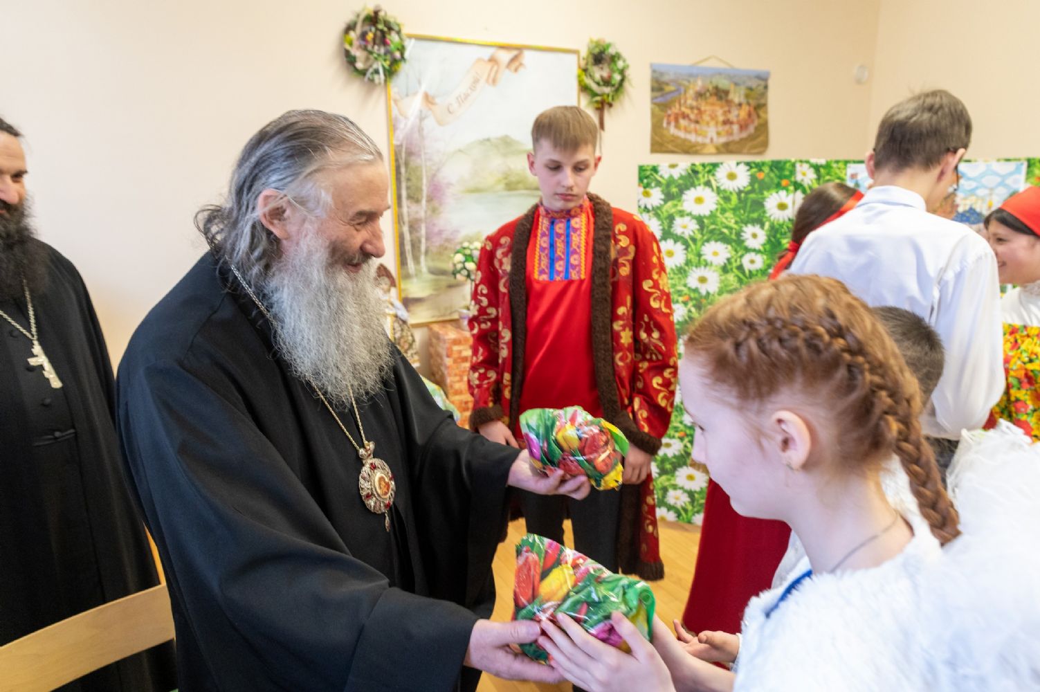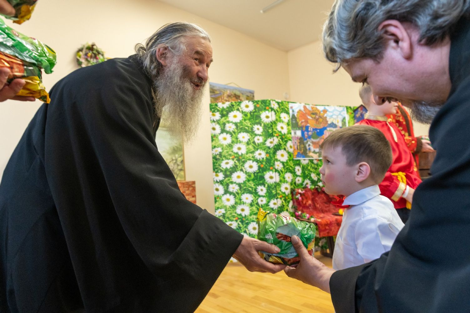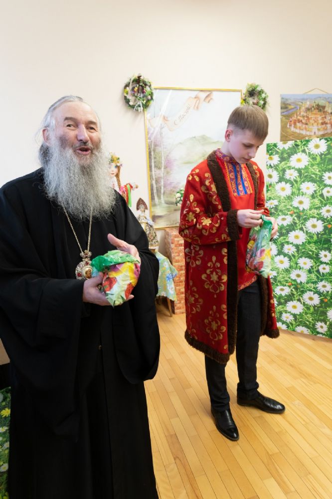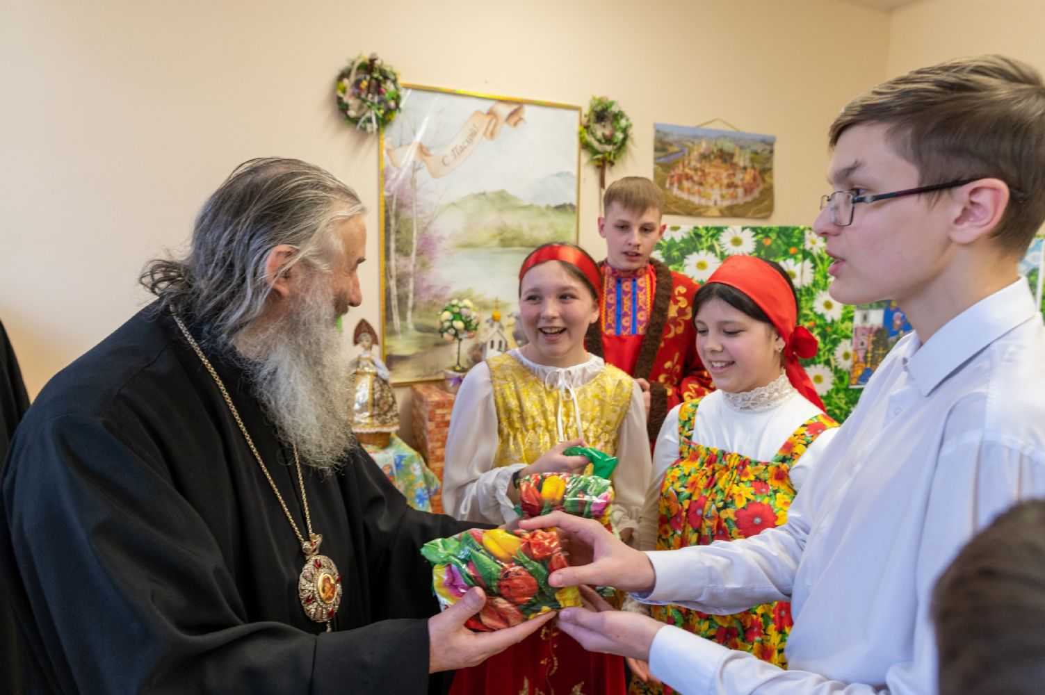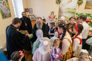 В завершение всех со светлым праздником Христова Воскресения поздравили воспитанники воскресной школы, показав праздничную концертную программу. Дети с воодушевлением читали стихи и исполняли песни, представили кукольный спектакль и костюмированное представление по сказке «Аленький цветочек». Всем юным актерам владыка вручил сладкие подарки.