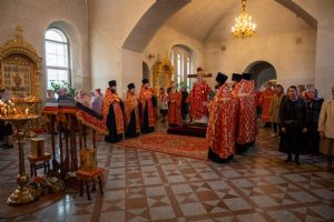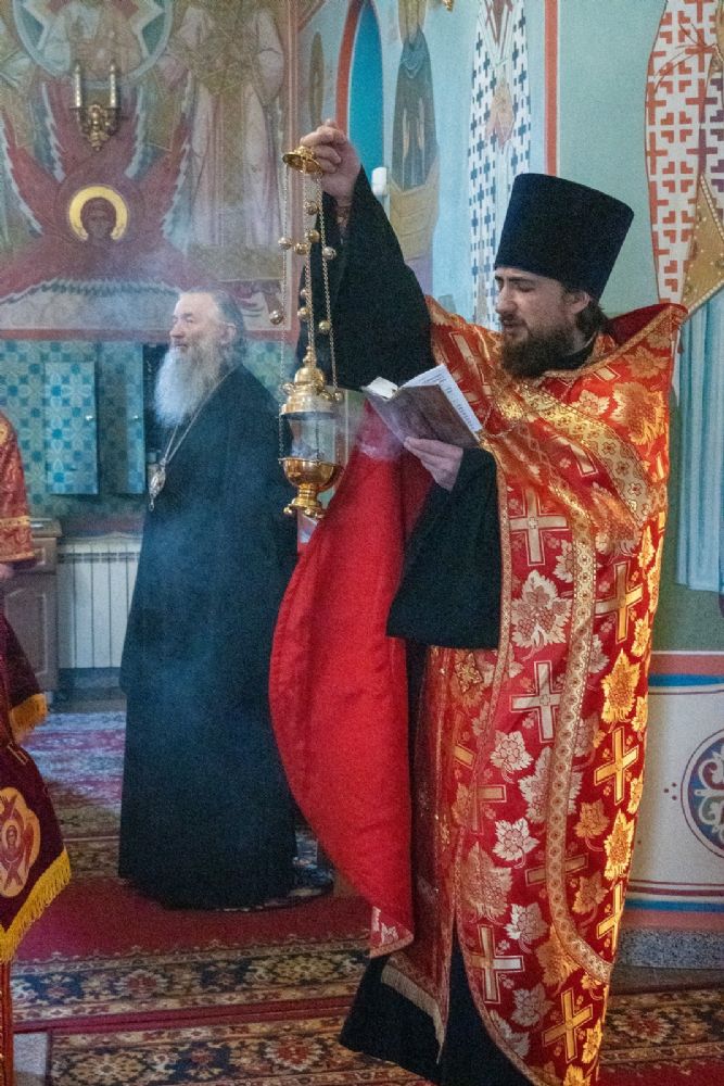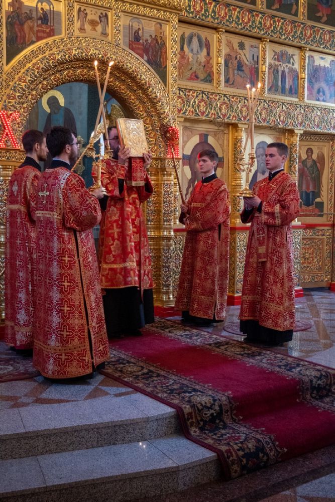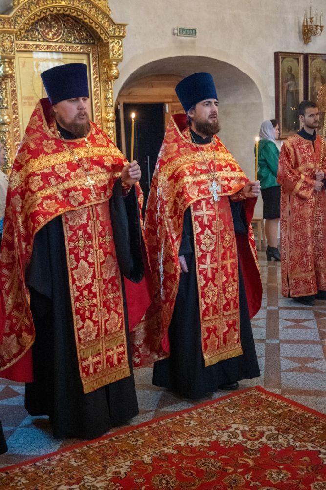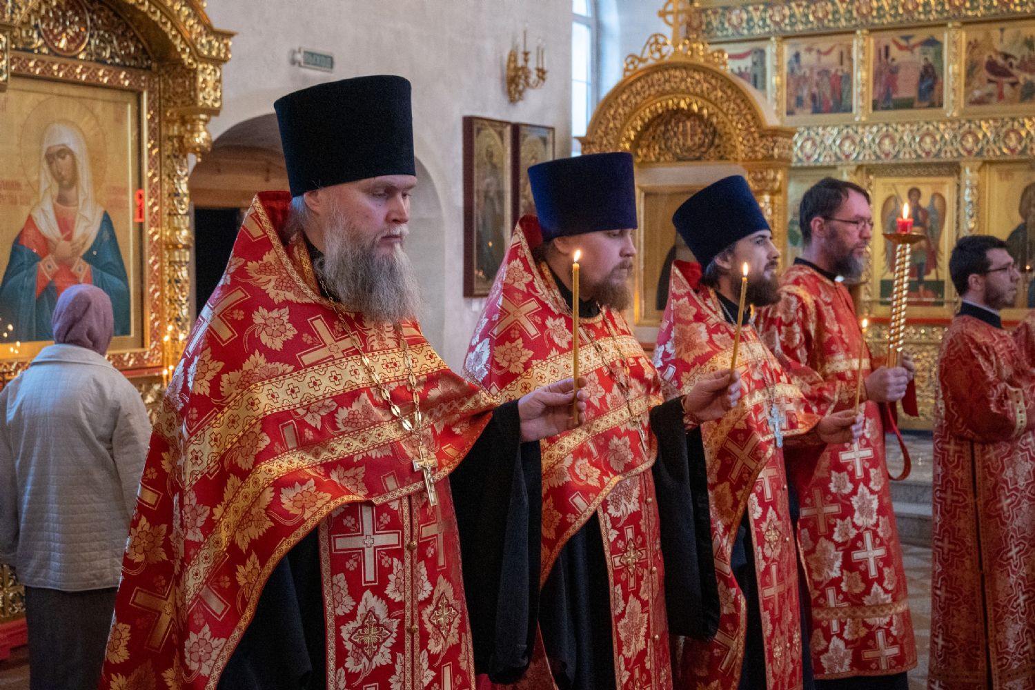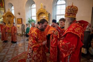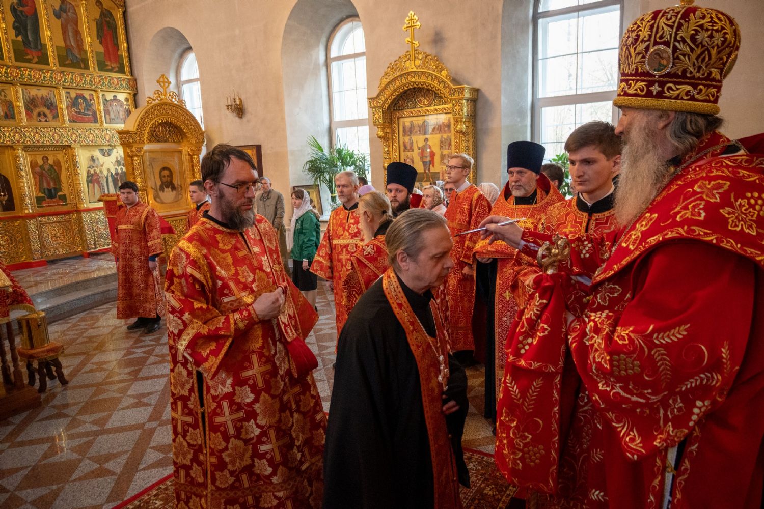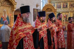 Его Высокопреосвященству сослужили настоятель храма протоиерей Александр Бачурин, полковой священник иерей Георгий Колотов, клирики храма протоиерей Василий Лихачев, иереи Константин Домрачев, Виктор Умрихин, Николай Бабич и диакон Алексий Ершов, а также протодиакон Михаил Козловский. Пел хор храма под управлением регента Елены Умрихиной.