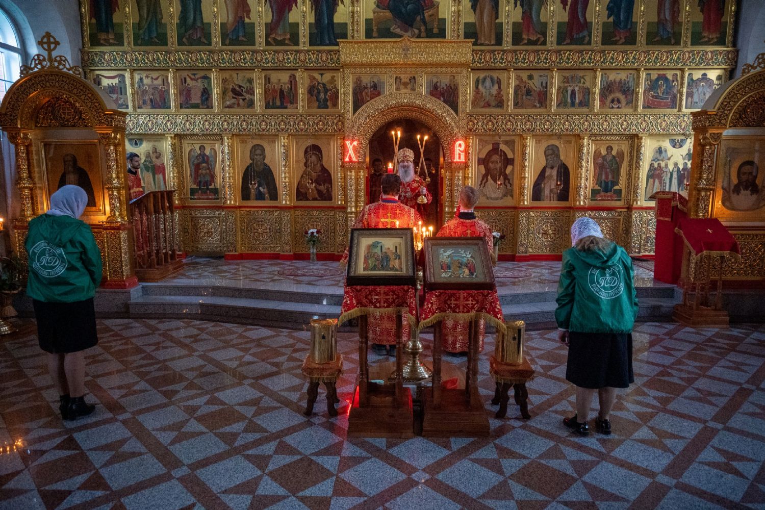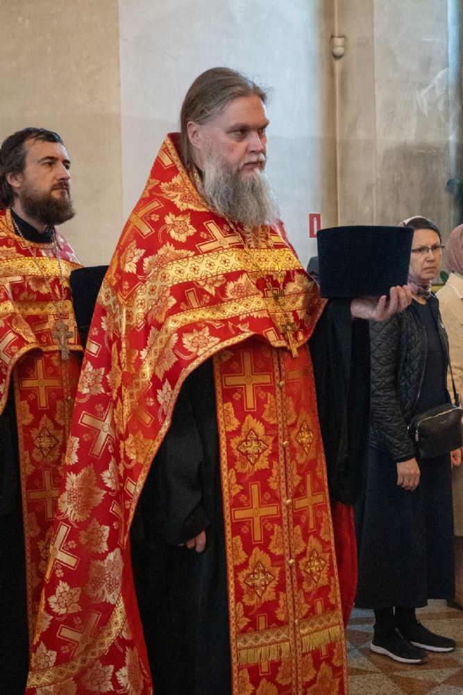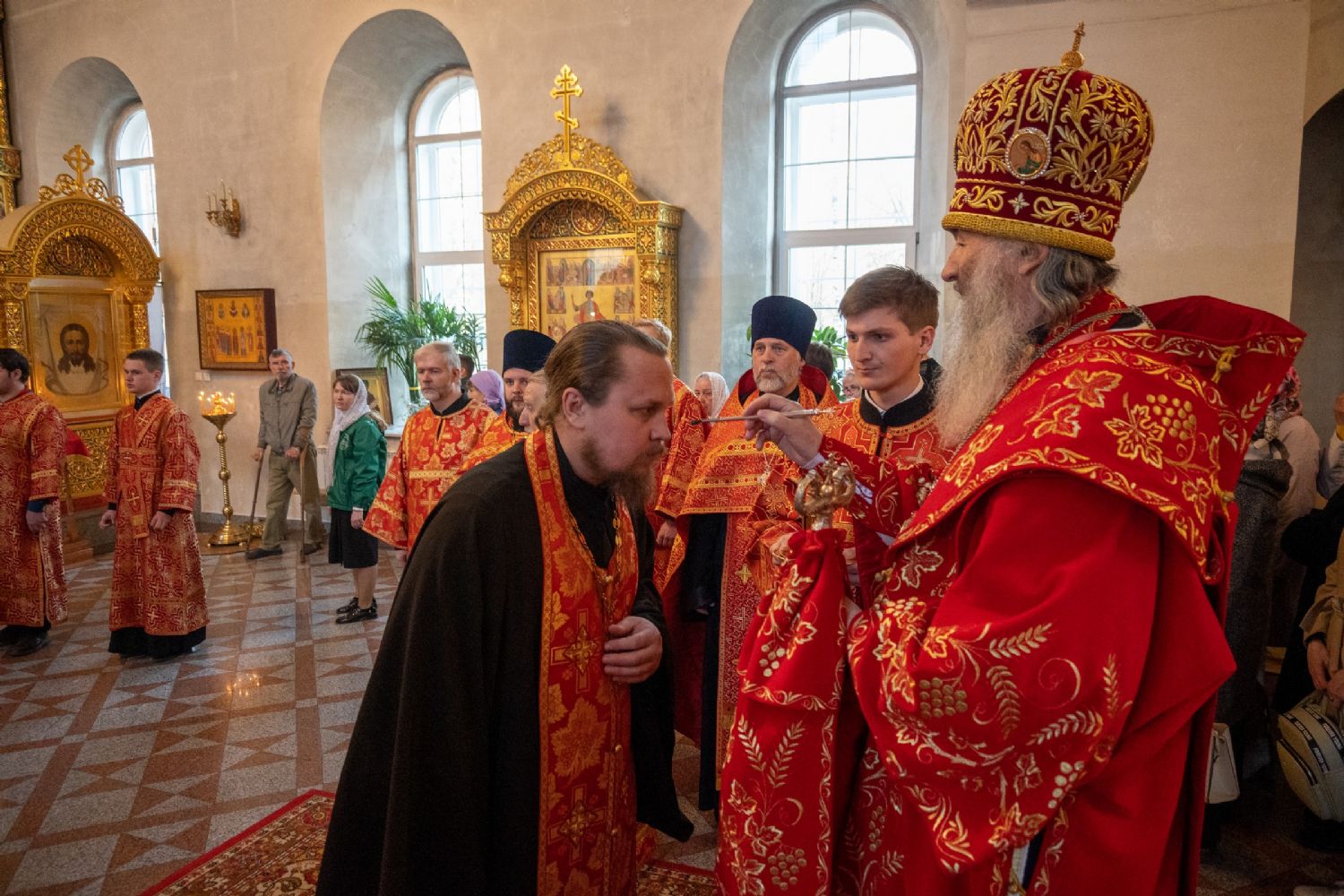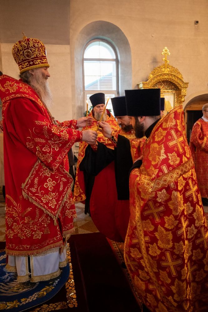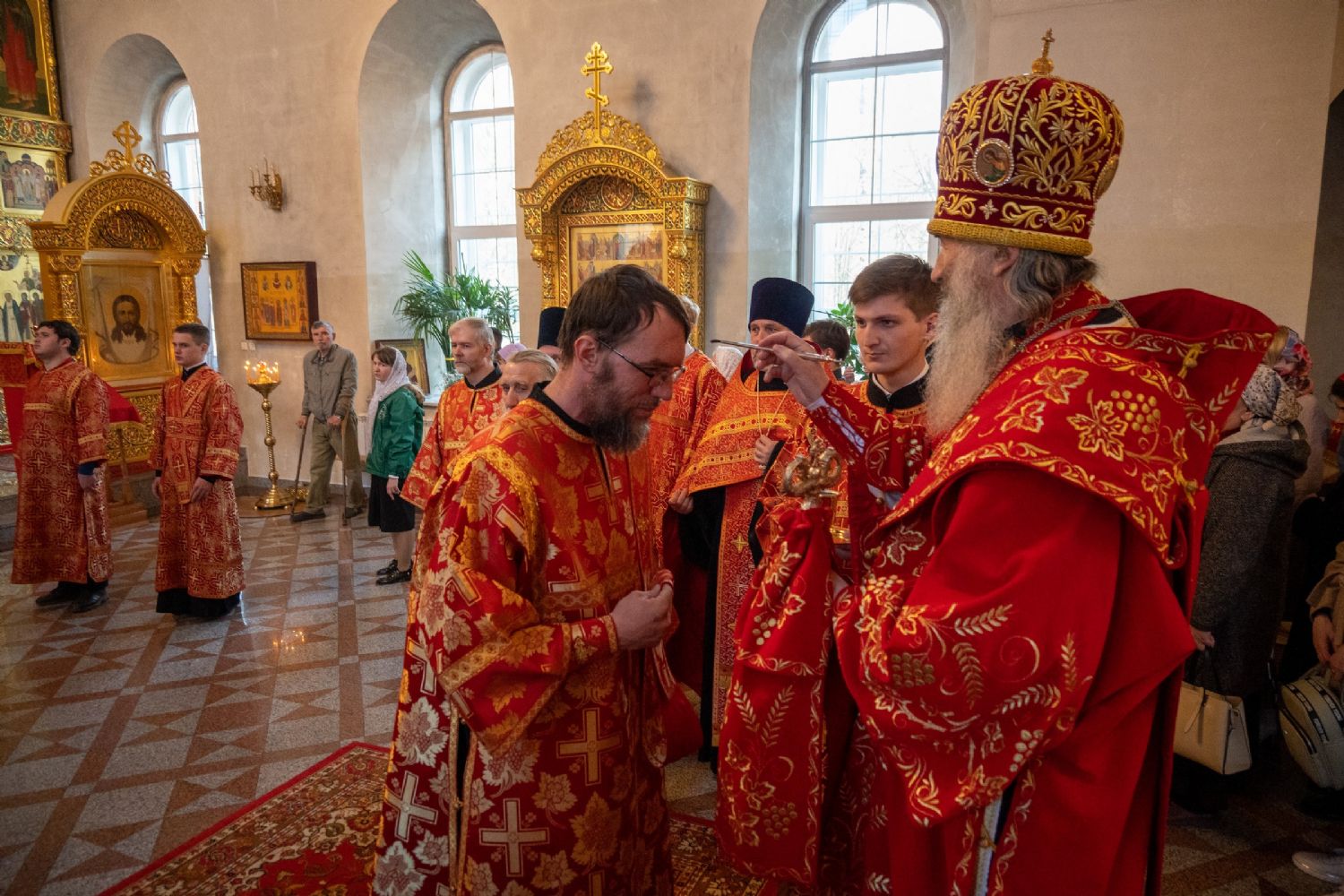 Его Высокопреосвященству сослужили настоятель храма протоиерей Александр Бачурин, полковой священник иерей Георгий Колотов, клирики храма протоиерей Василий Лихачев, иереи Константин Домрачев, Виктор Умрихин, Николай Бабич и диакон Алексий Ершов, а также протодиакон Михаил Козловский. Пел хор храма под управлением регента Елены Умрихиной.
