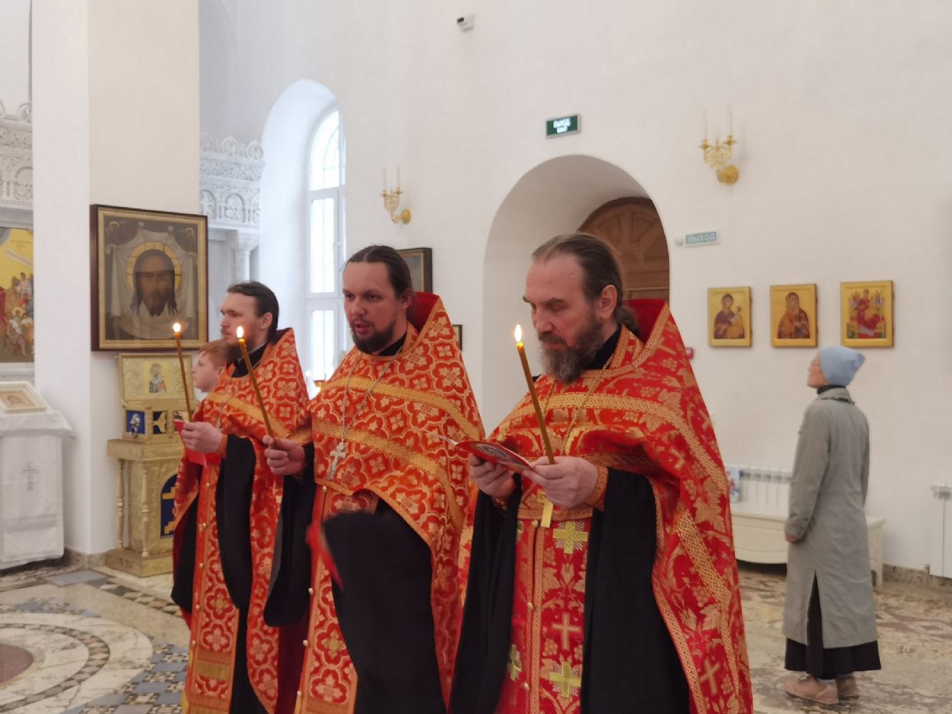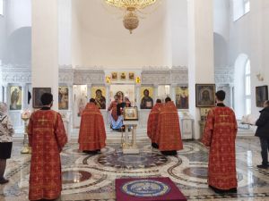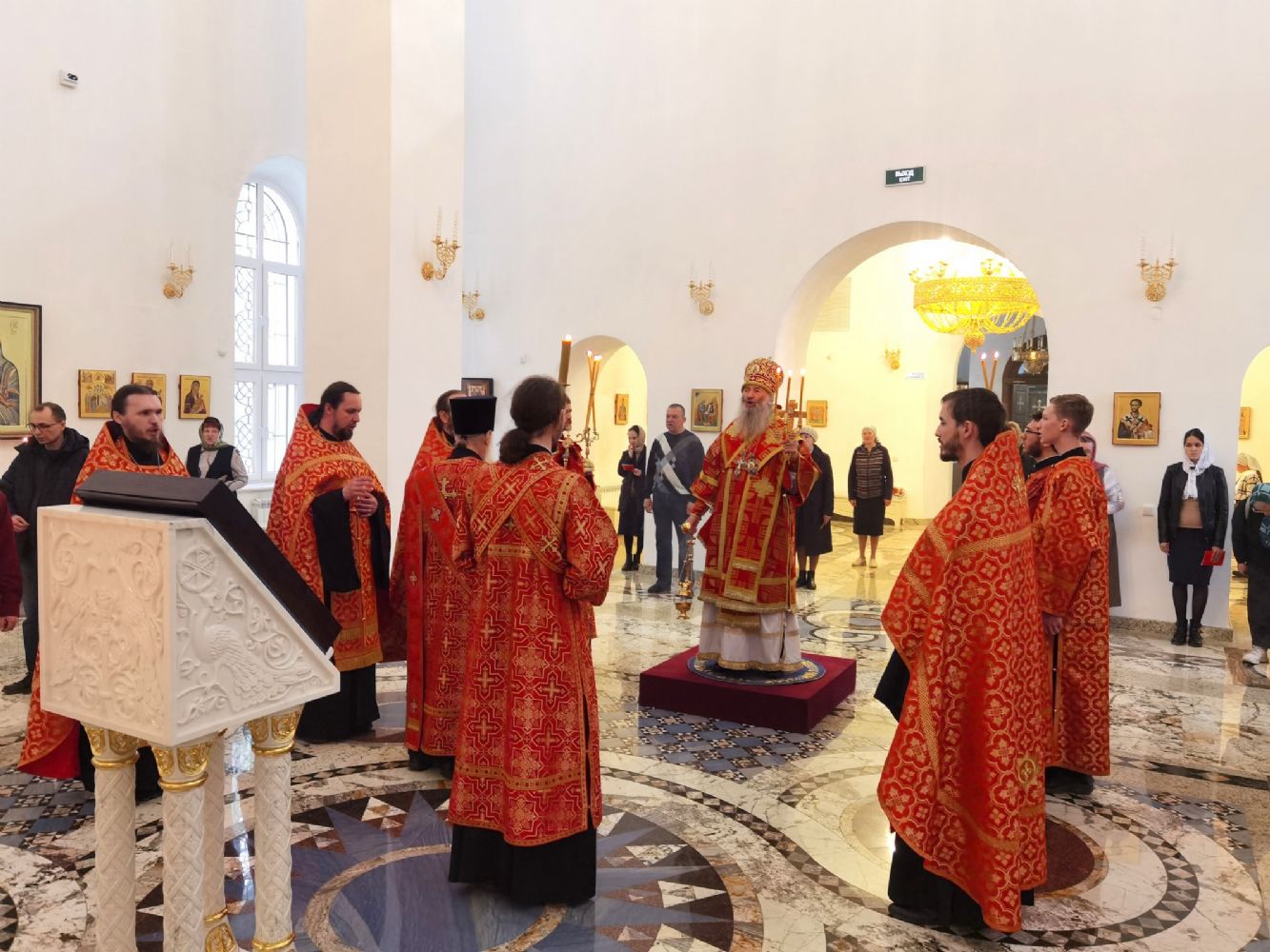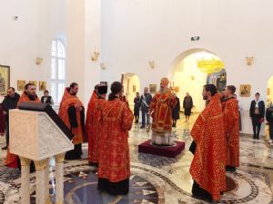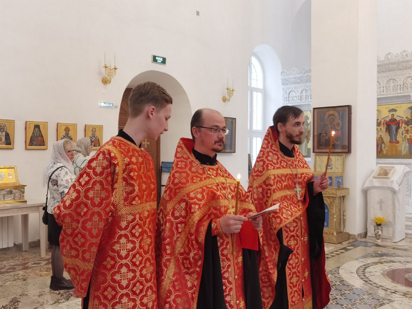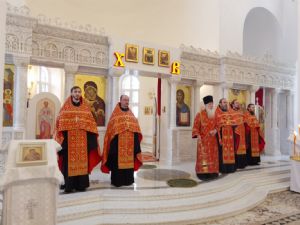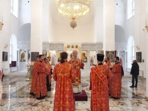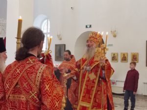 Владыке сослужили секретарь Йошкар-Олинского епархиального управления иеромонах Серафим (Пасанаев), настоятель храма иерей Алексий Михеев, клирики храма иереи Димитрий Лукьянов, Сергий Пуртов, Игорь Коваль, а также протодиакон Михаил Козловский и клирик Благовещенского кафедрального собора диакон Андрей Дружинин. Песнопения исполнял хор храма под управлением Александры Ивановой.