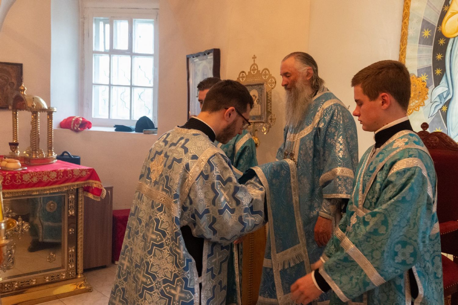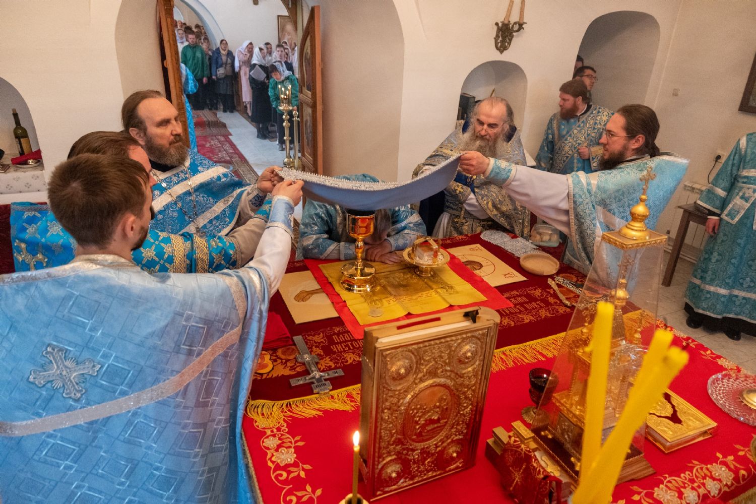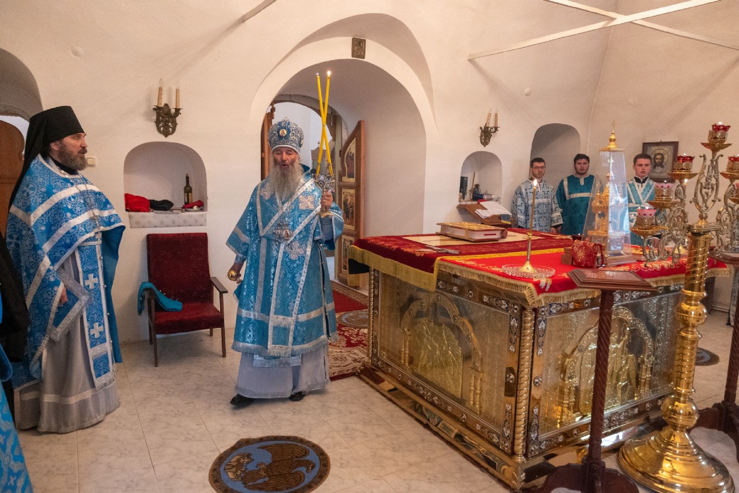 Архипастырю сослужили секретарь Йошкар-Олинского епархиального управления иеромонах Серафим (Пасанаев), клирик монастыря иерей Михаил Лежнин и духовенство храмов г. Йошкар-Олы. Песнопения исполнял детско-юношеский хор «Благовест» под управлением Татьяны Черновой.