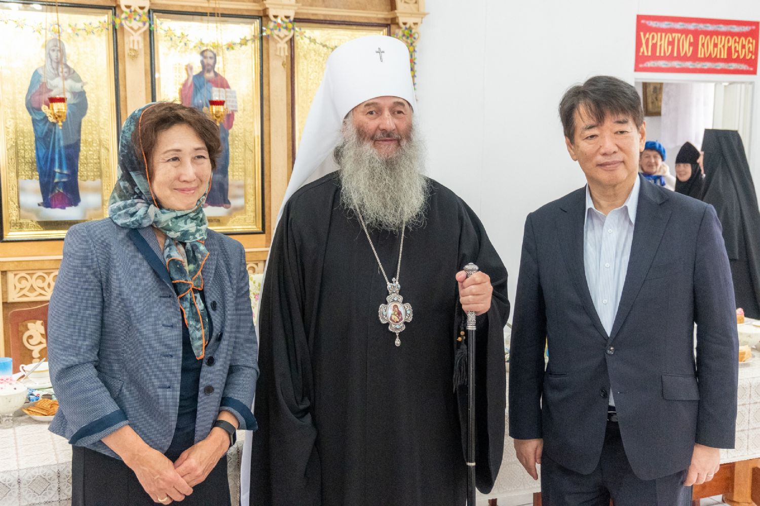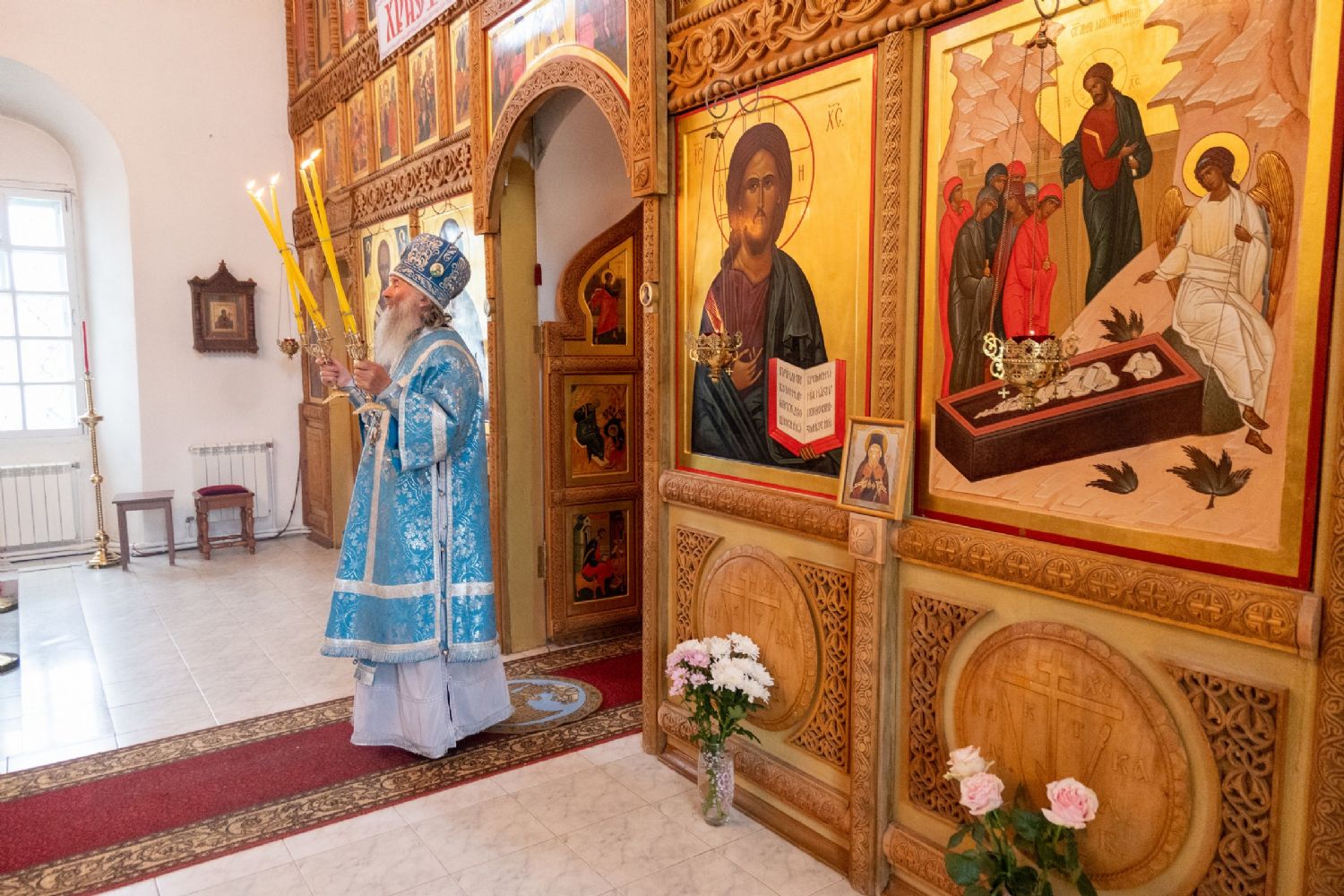 «В эти светоносные пасхальные дни Царица Небесная всех нас привела в Свой дом, чтобы мы с вами, взирая на Ее чудотворный образ «Мироносицкий», еще и еще раз уверились в истинности Воскресения Христова, уверились что Она первая сподобилась после благовестия Ангела узреть Воскресшего Христа. Если мы с вами внимательно всмотримся в этот чудотворный образ Пречистой Богоматери, то увидим, что Она изображена на фоне пещеры Гроба Господня с Женами Мироносицами, которые восхваляют Воскресение Христово и свидетельствуют, что воистину Христос Воскрес.