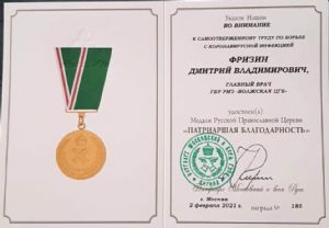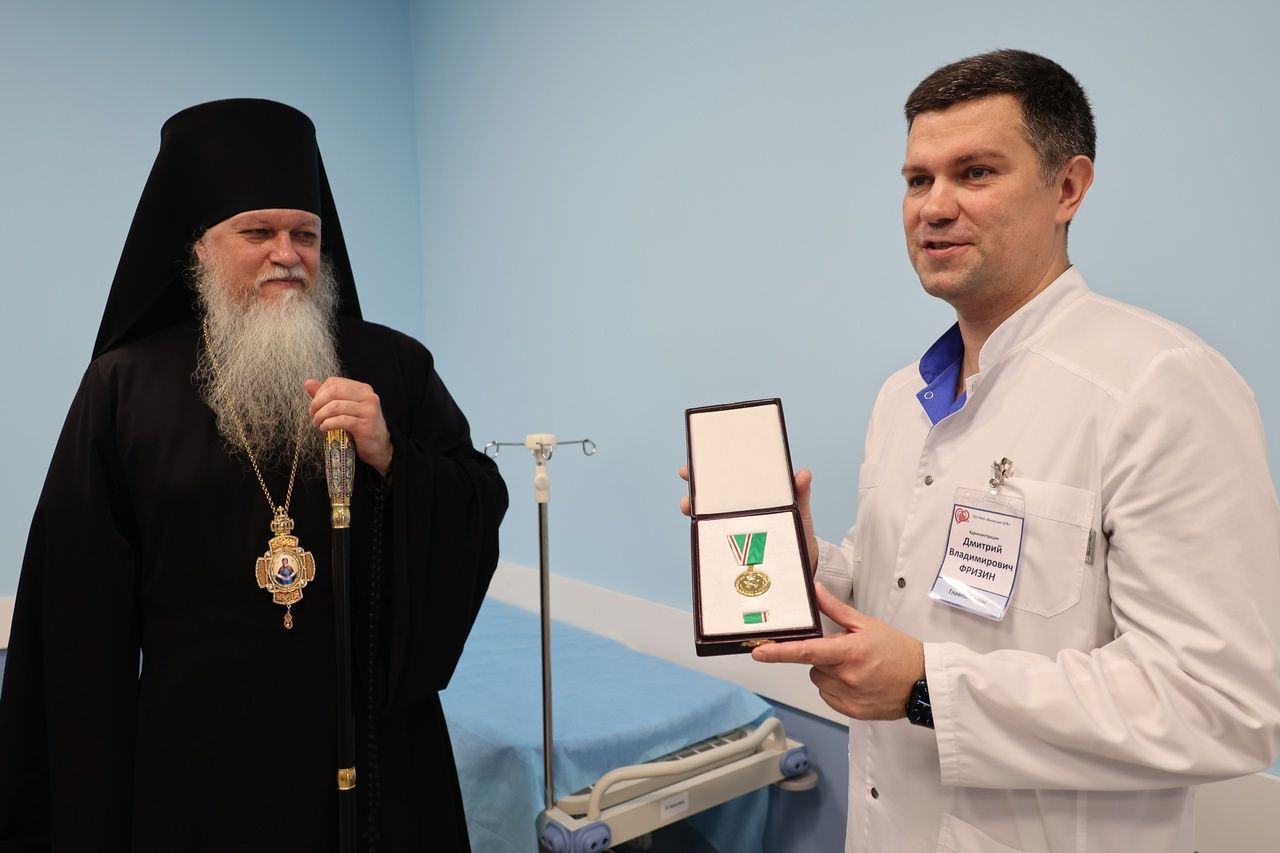 Епископ Феофан вручил главному врачу ГБУ РМЭ «Волжская ЦГБ» Дмитрию Владимировичу Фризину Патриаршую награду – Медаль Русской Православной Церкви «Патриаршая благодарность».