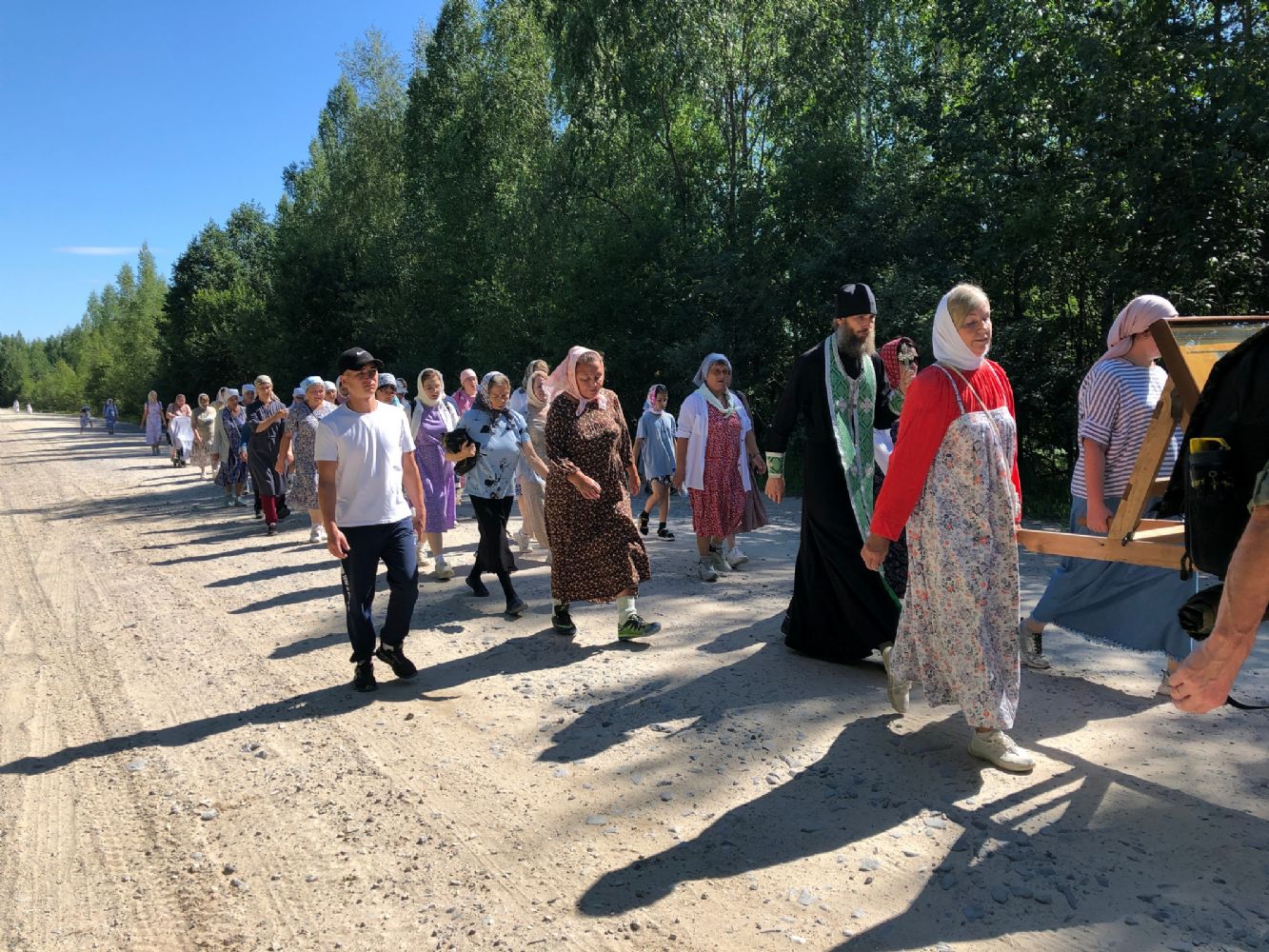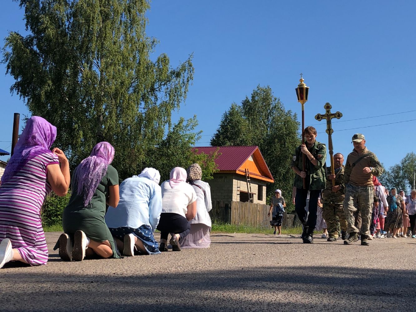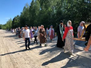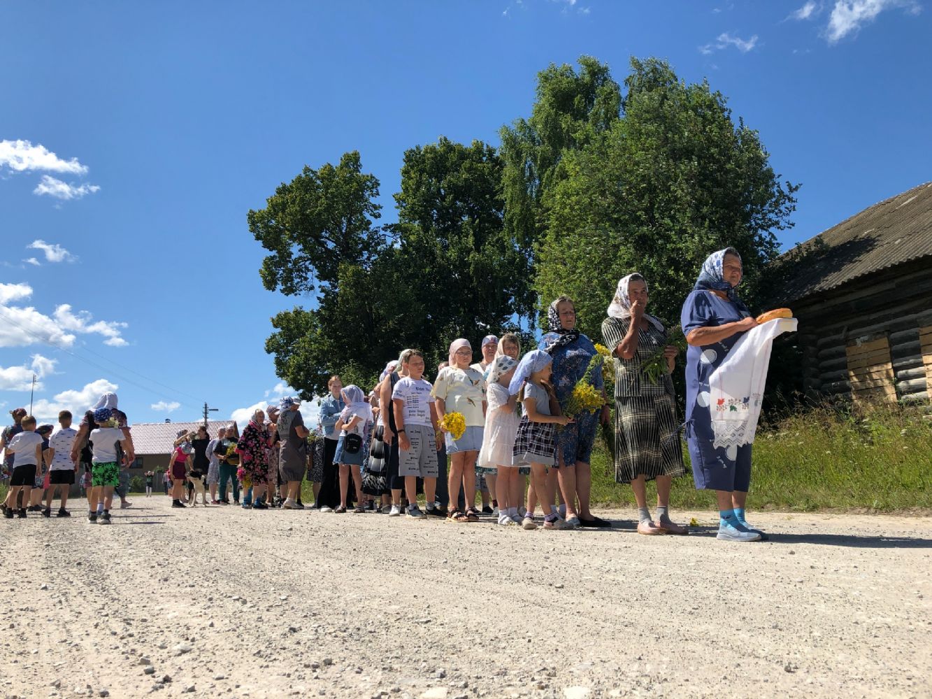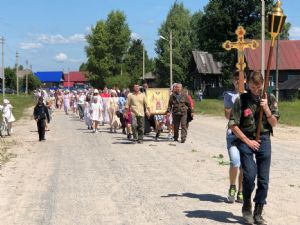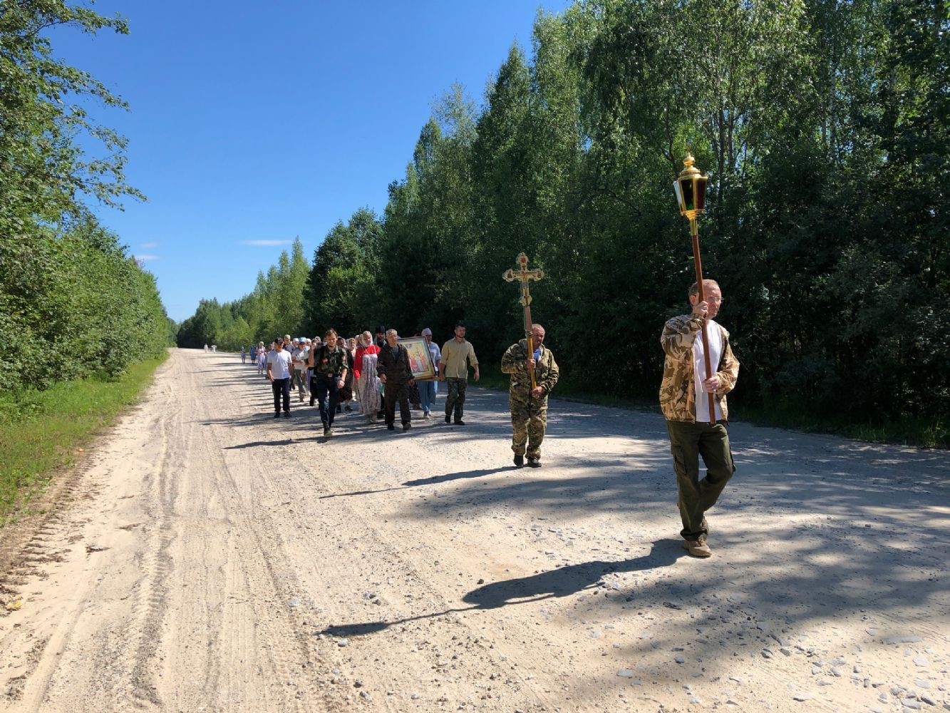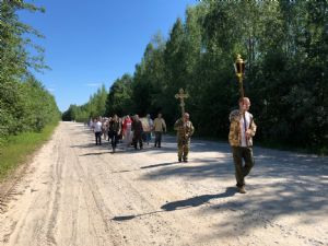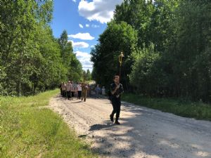 Следует отметить, что этот крестный ход протяженностью 23 километра весьма непростой – основная часть маршрута проходит по грунтовой дороге, через лес. Жители встречающихся на пути населенных пунктов радушно встречали крестоходцев, прикладывались к иконам, а некоторые присоединялись к молитвенному шествию. В деревне Памъялы была сделана остановка на отдых. Отец Андрей отслужил молебен у часовни Святой Троицы, обратился к собравшимся с пастырским словом. Местные жители накрыли столы с угощением – подкрепившись, крестоходцы двинулись дальше.