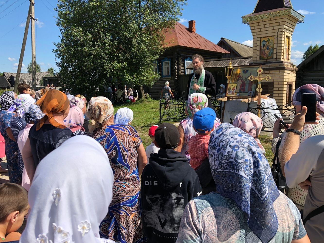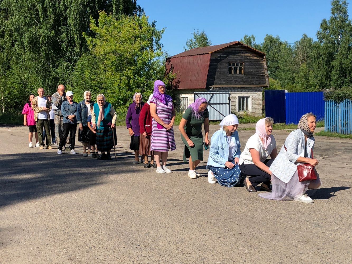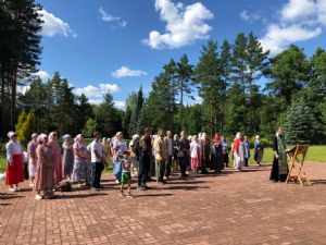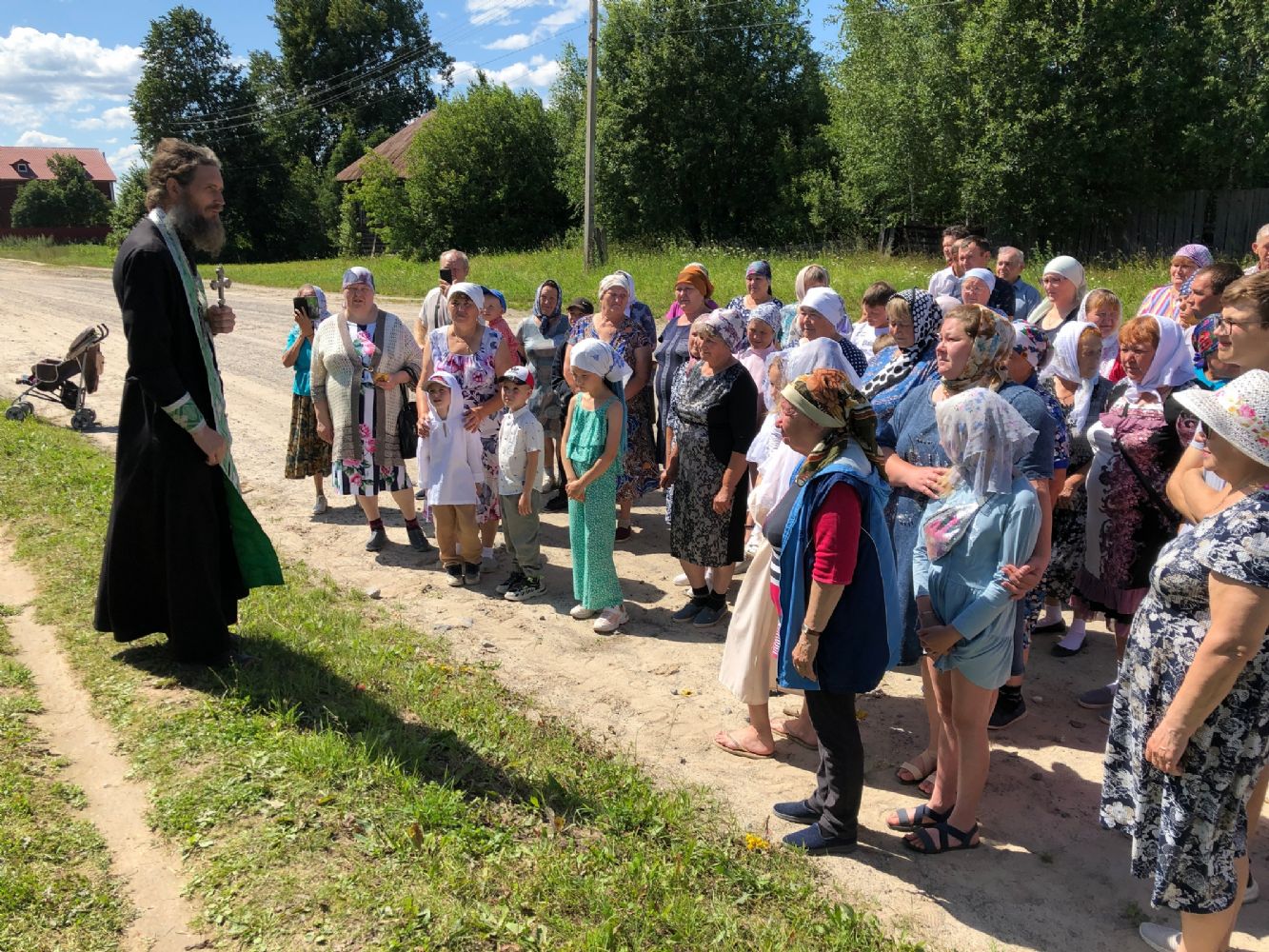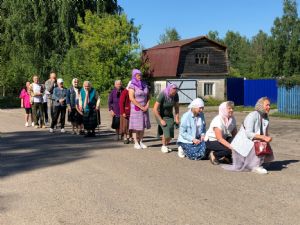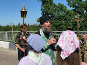 Следует отметить, что этот крестный ход протяженностью 23 километра весьма непростой – основная часть маршрута проходит по грунтовой дороге, через лес. Жители встречающихся на пути населенных пунктов радушно встречали крестоходцев, прикладывались к иконам, а некоторые присоединялись к молитвенному шествию. В деревне Памъялы была сделана остановка на отдых. Отец Андрей отслужил молебен у часовни Святой Троицы, обратился к собравшимся с пастырским словом. Местные жители накрыли столы с угощением – подкрепившись, крестоходцы двинулись дальше.