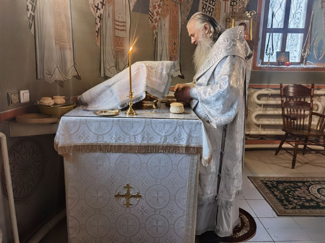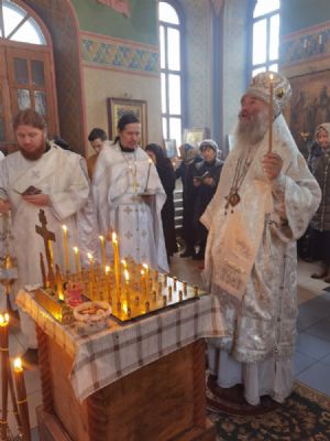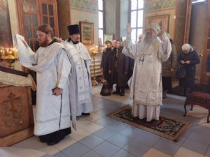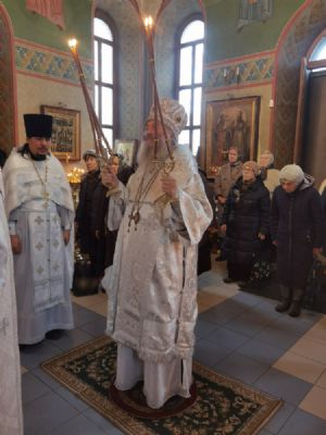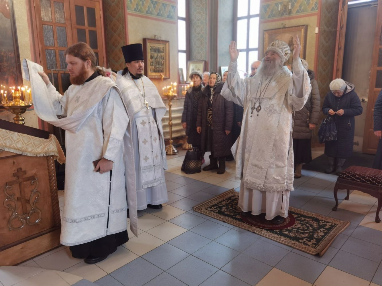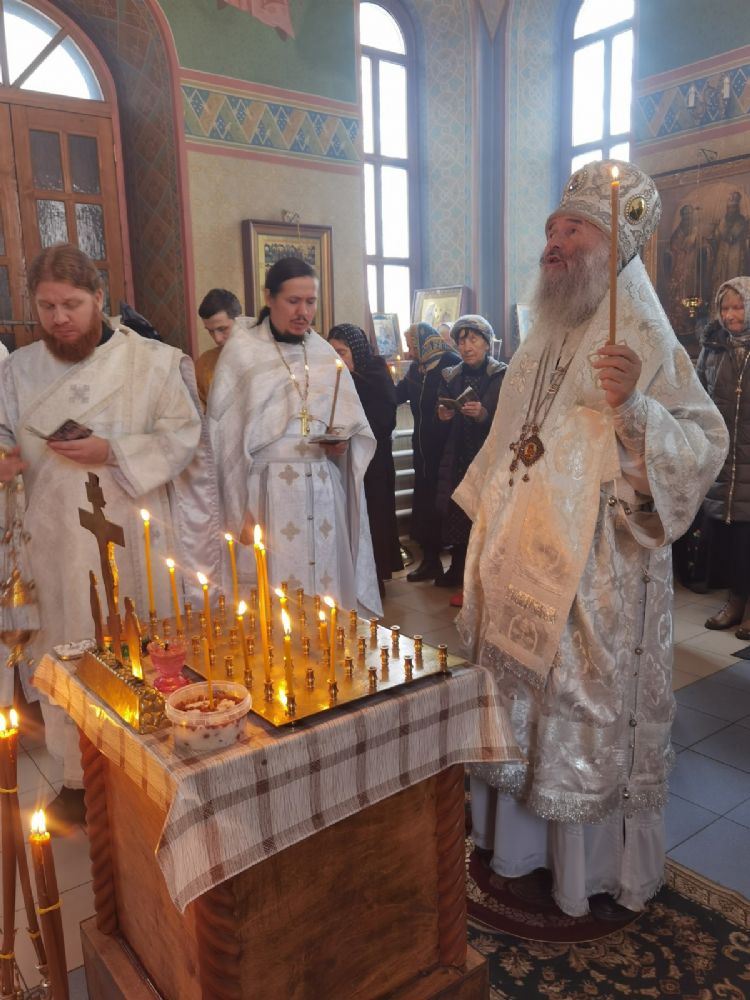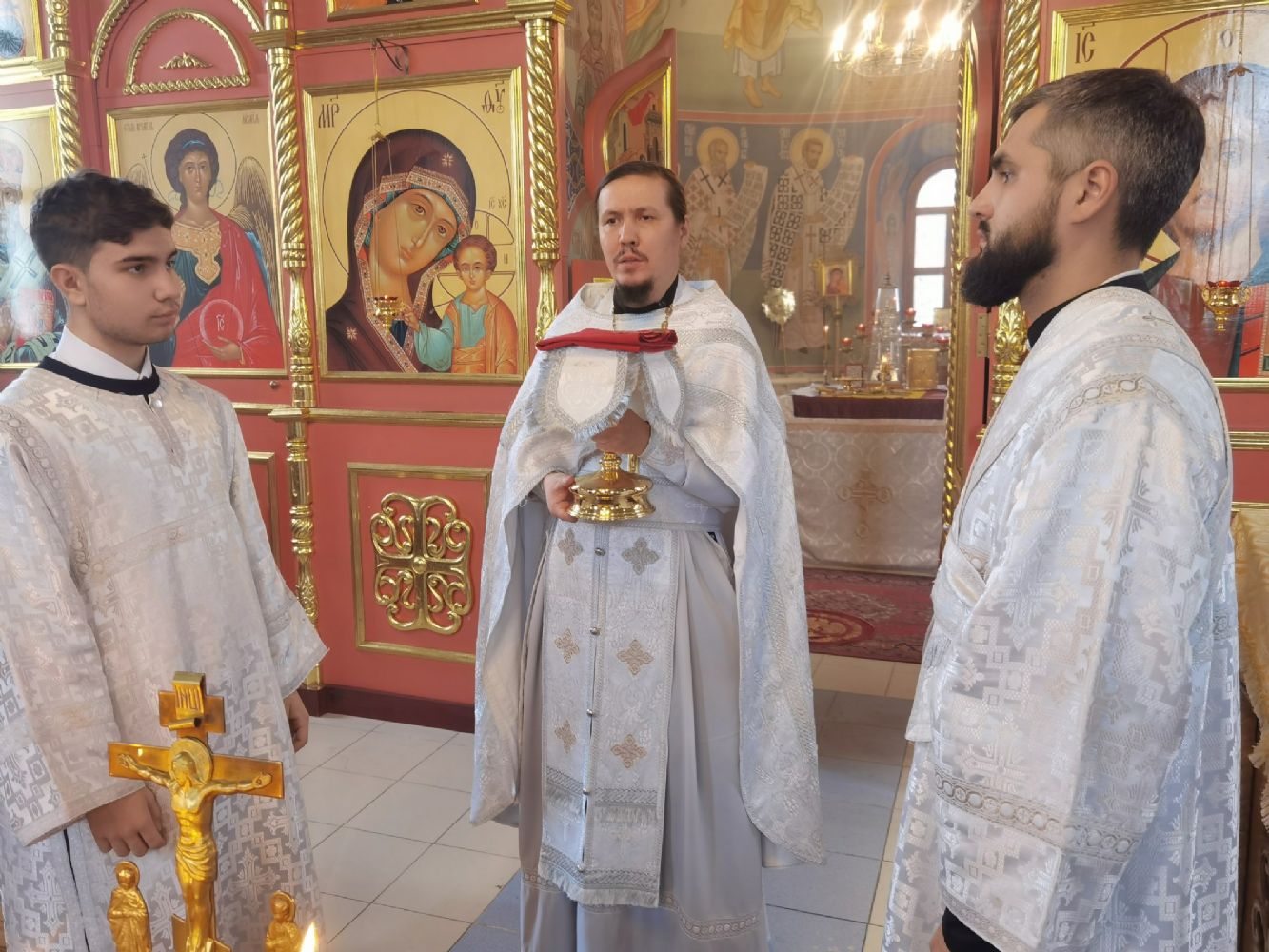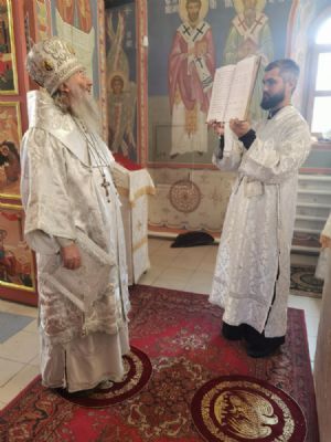 Владыке сослужили клирик храма Рождества Пресвятой Богородицы с. Семеновка иерей Сергий Асланов и клирик Благовещенского кафедрального собора диакон Андрей Дружинин. Песнопения исполнял хор храма Рождества Пресвятой Богородицы с. Семеновка.