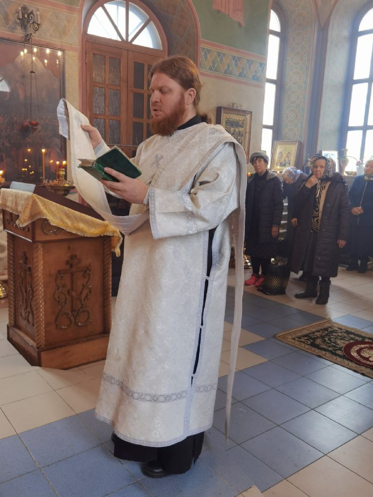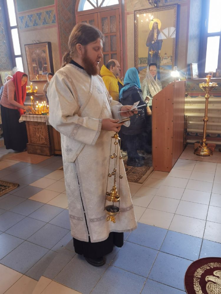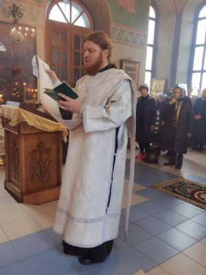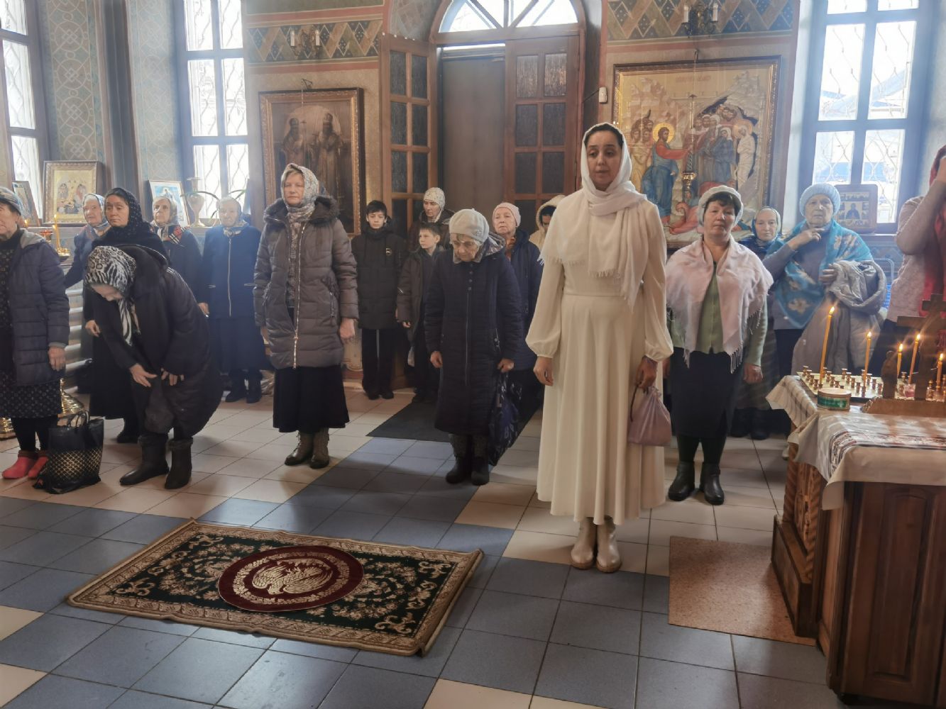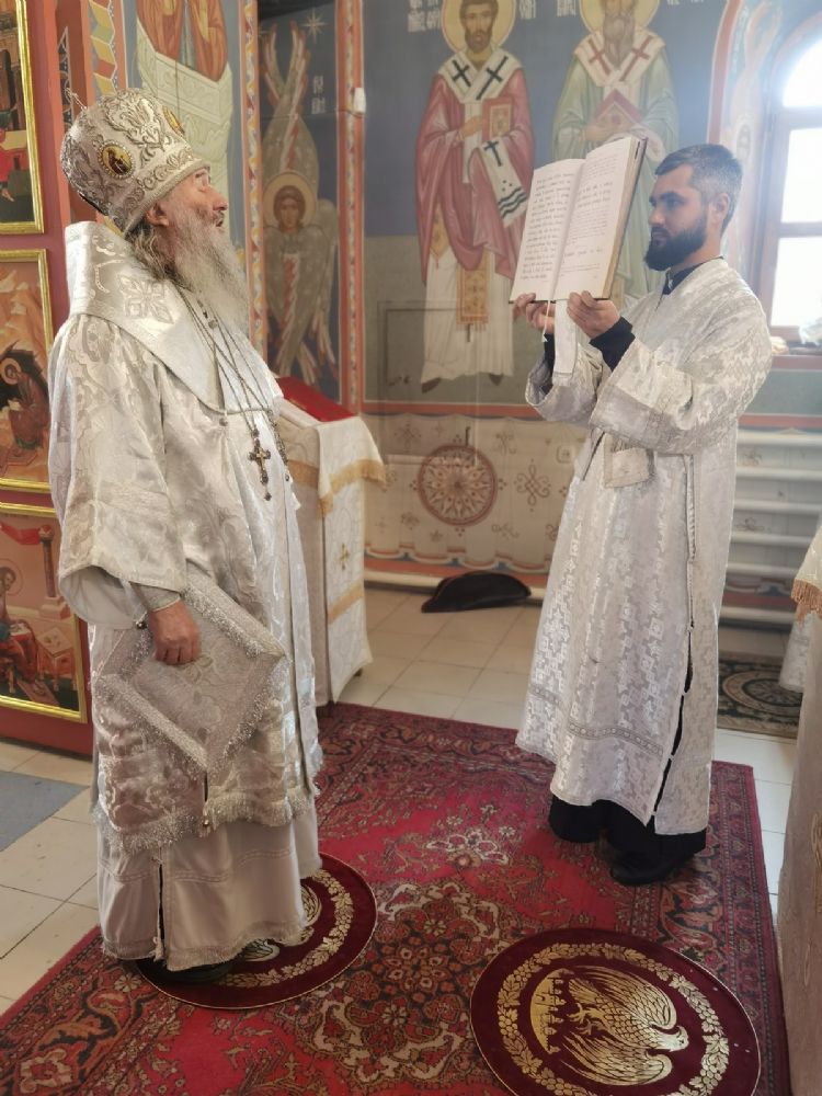 Владыке сослужили клирик храма Рождества Пресвятой Богородицы с. Семеновка иерей Сергий Асланов и клирик Благовещенского кафедрального собора диакон Андрей Дружинин. Песнопения исполнял хор храма Рождества Пресвятой Богородицы с. Семеновка.