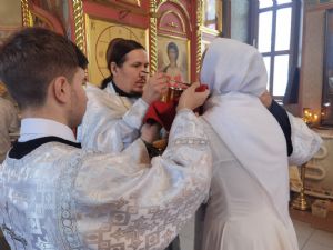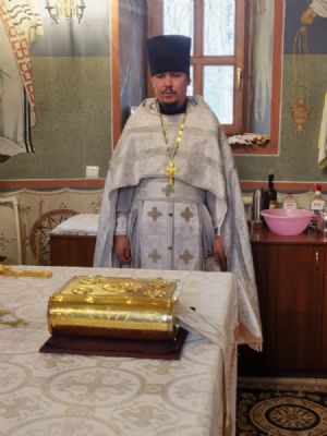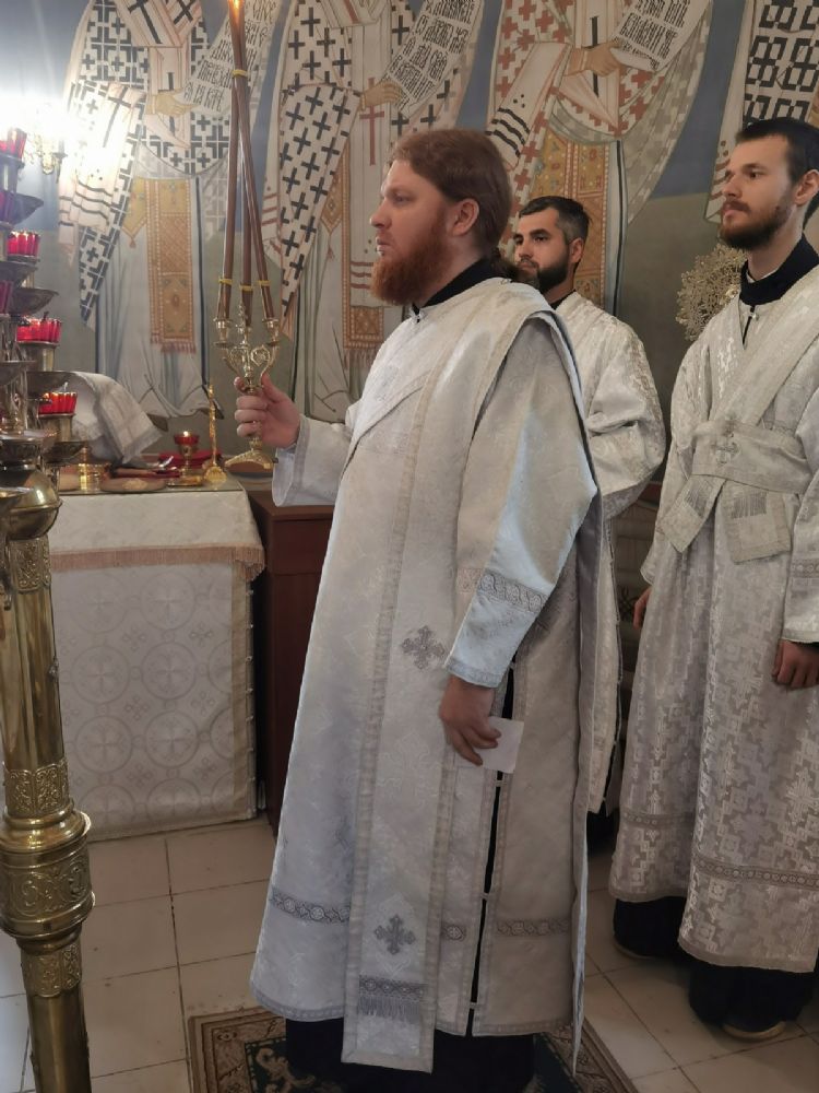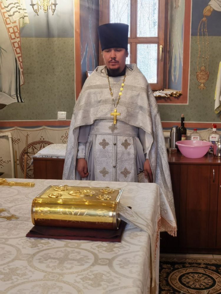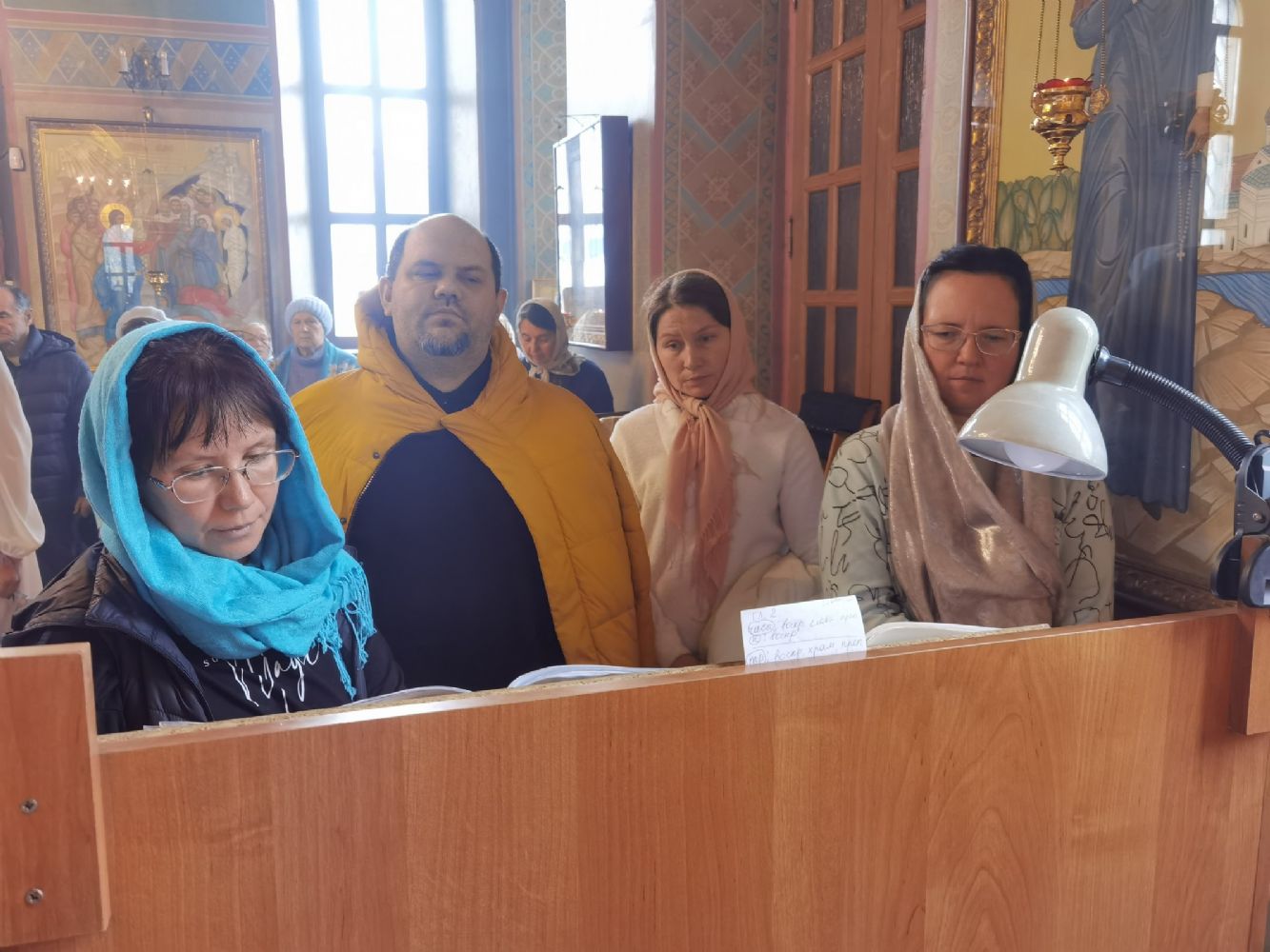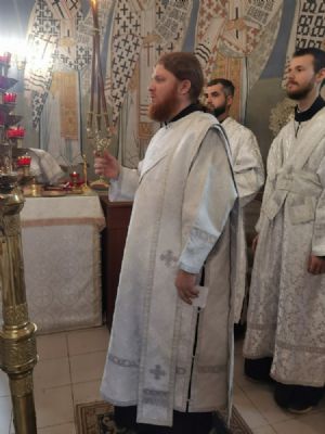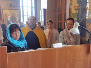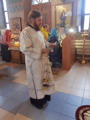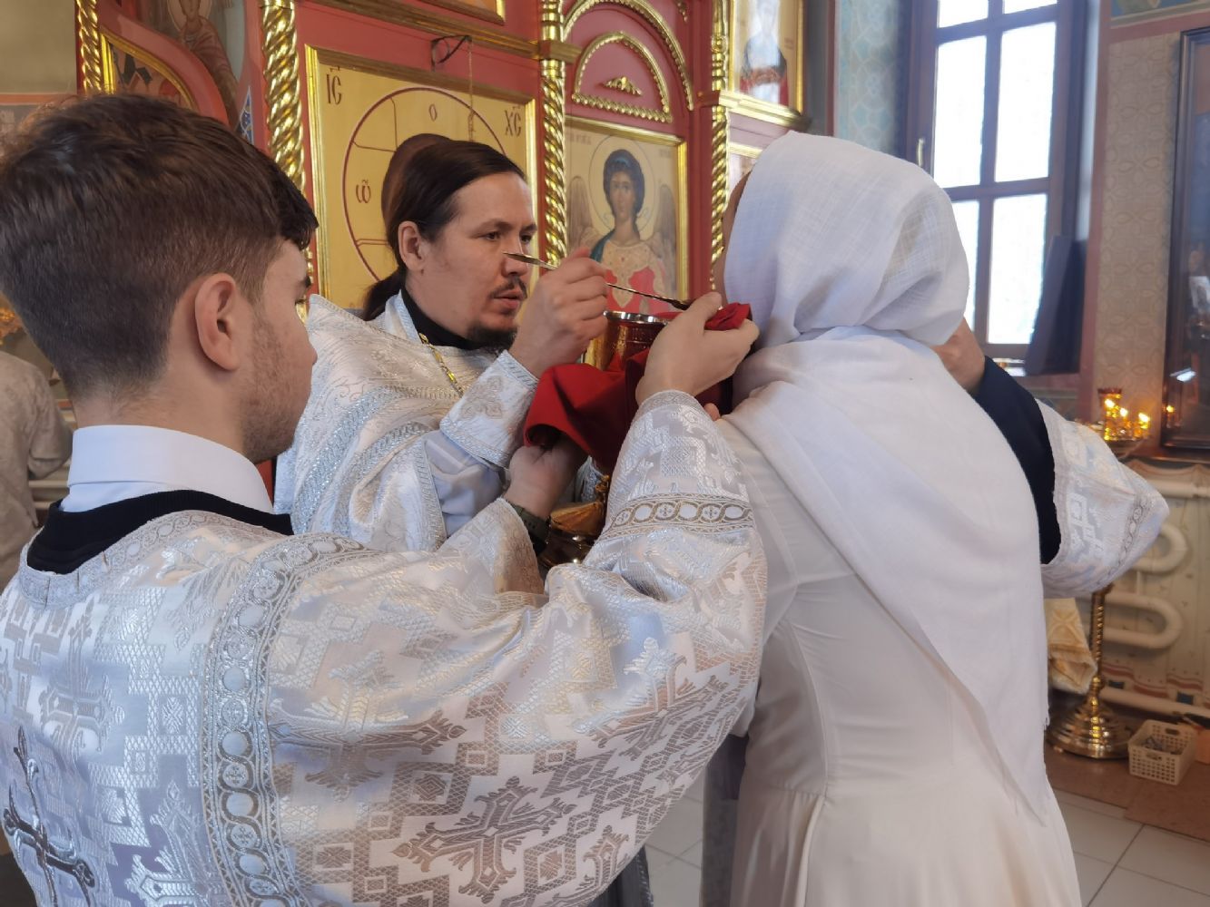 Владыке сослужили клирик храма Рождества Пресвятой Богородицы с. Семеновка иерей Сергий Асланов и клирик Благовещенского кафедрального собора диакон Андрей Дружинин. Песнопения исполнял хор храма Рождества Пресвятой Богородицы с. Семеновка.