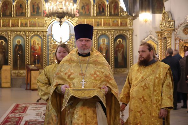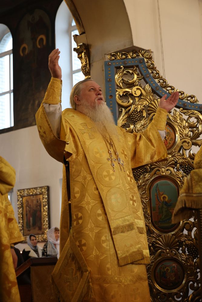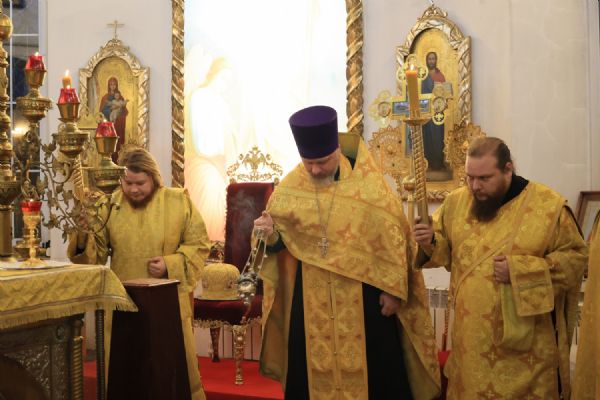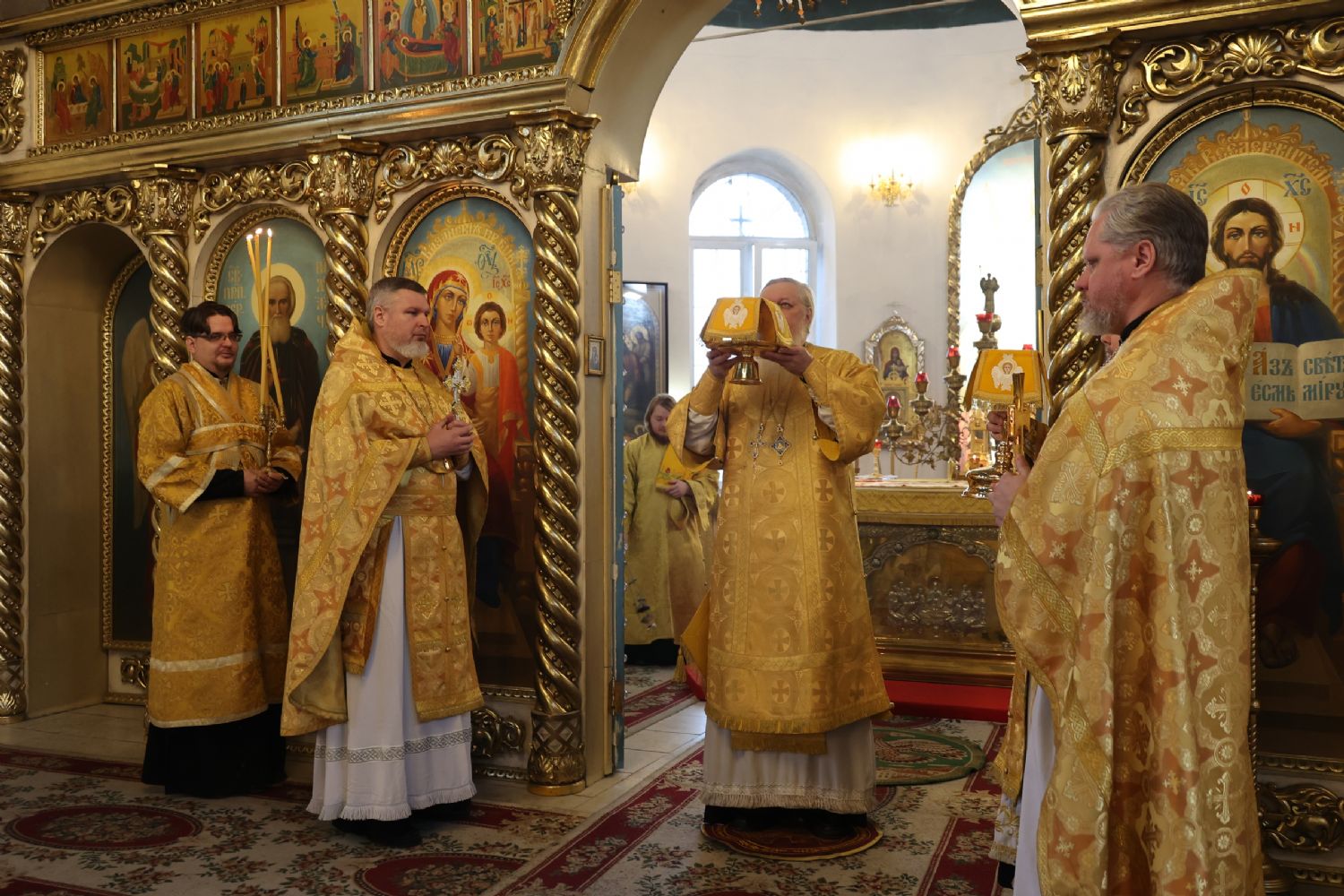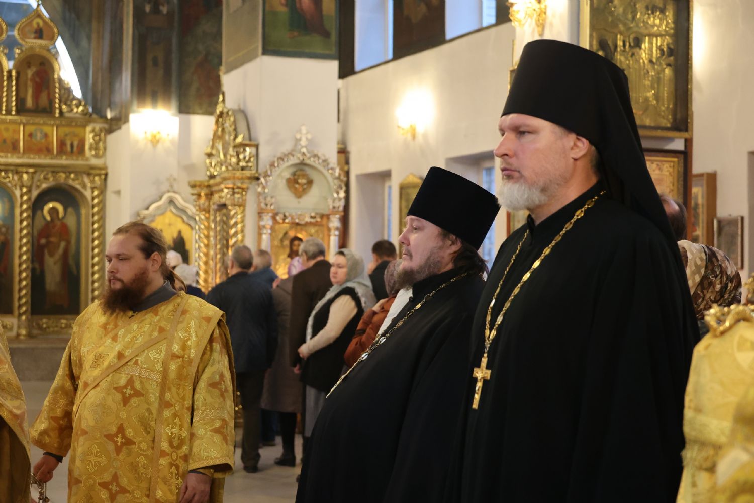 Его Преосвященству сослужили клирики собора, песнопения исполнял архиерейский хор под управлением регента Любови Михеевой. За Литургией также пел народный хор под управлением Евгения Чигарова.