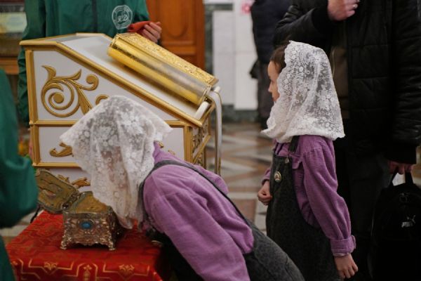 На вечерне читались паремии из книг Бытия и Второзакония, посвященные ветхозаветным праведникам, из рода которых произошел по человечеству Господь наш Иисус Христос.