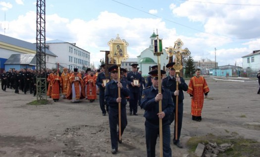 За богослужением соборно молились осужденные и кадровый офицерский состав колонии во главе с начальником учреждения Александром Колгановым и его заместителем Владимиром Голубевым. После литургии молящиеся совершили крестный ход по жилой зоне.