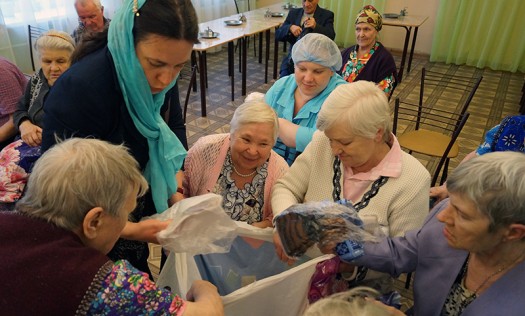 В заключение все вместе исполнили любимую песню сормовичей – «Сормовскую лирическую». Затем социальные работники при помощи волонтеров раздали пожилым людям пасхальные гостинцы и подарки, собранные прихожанами сормовских храмов: чай, печенье, пряники, куличи, сувениры, предметы одежды и личной гигиены. Тем, кто не смог спуститься в актовый зал, подарки принесли в палаты.