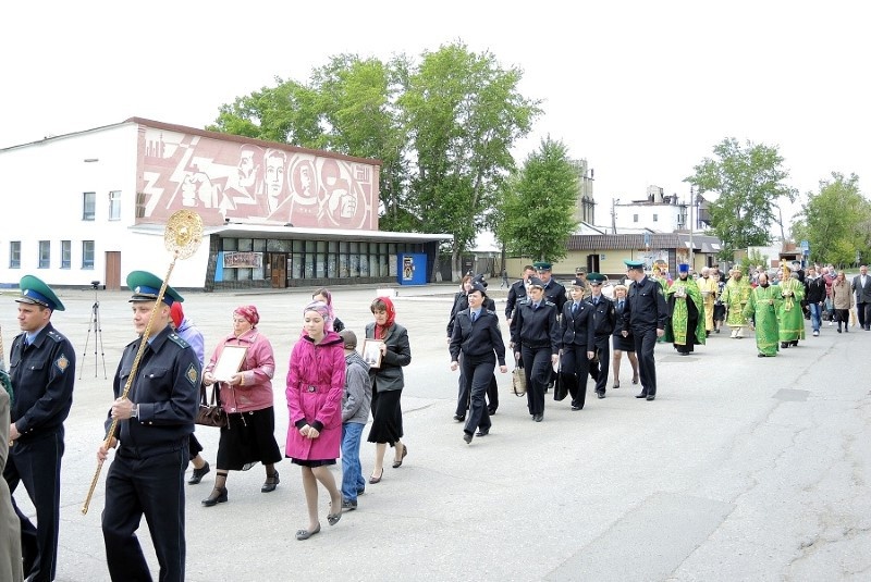 По окончании литургии в храме собрались офицеры, прапорщики и солдаты пограничной комендатуры ФСБ г. Карасука для участия в крестном ходе, посвящённом 95-летию пограничных войск России.
