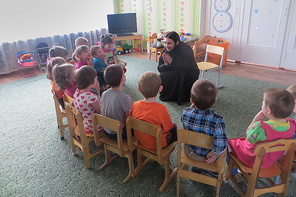 Священник побеседовал с воспитанниками на тему одной из евангельских притч. Затем молодые добровольцы разбились на группы организовали досуг воспитанников детского дома. За время встречи здесь прошли несколько творческих конкурсов и состязаний, открылась «парихмахерская», где маленькие девочки перенимали приемы по уходу за своими прическами.