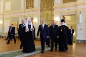 В верхнем храме в честь святого равноапостольного князя Владимира к Президенту В.В. Путину обратился Святейший Патриарх Кирилл: «Я хотел бы сердечно Вас приветствовать в этом историческом месте. Именно здесь, в этой палате, проходило большинство пленарных заседаний Поместного Собора 1917-1918 гг., который восстановил Патриаршество. Здесь были избраны три кандидата, из которых один затем был избран жребием, — и жребий пал на святителя Тихона».