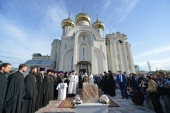 После осмотра храма Предстоятель Русской Православной Церкви совершил чин освящения закладного камня в основание нового здания школы святого равноапостольного князя Владимира.