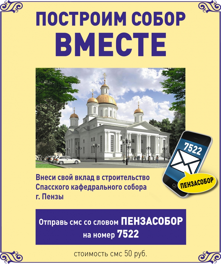 У Пензенской епархии скоро появится новый, собственный, короткий номер для смс-пожертвований – 7522. Чтобы сделать пожертвование на восстановление Спасского кафедрального собора, теперь достаточно будет просто отправить SMS на указанный номер с префиксом ПЕНЗАСОБОР. После этого с другого, сервисного, номера вам придет запрос на подтверждение платежа. Не забудьте ответить на него — без этого платеж не пройдет. Более подробная информация для абонентов сотовых операторов здесь.