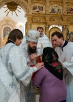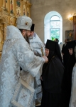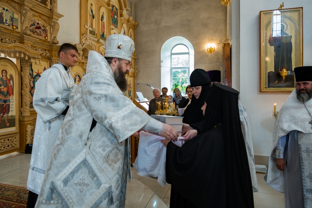 По окончании Литургии, настоятельница Нижнеломовского Успенского монастыря игумения Варвара (Трофимова) поблагодарила правящего архиерея за совместную молитву и преподнесла в дар владыке памятный подарок.