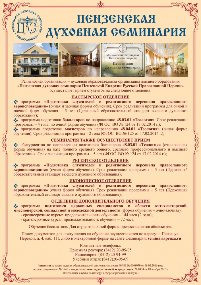 Религиозная организация – духовная образовательная организация высшего образования «Пензенская духовная семинария Пензенской епархии Русской Православной Церкви» осуществляет прием студентов на следующие отделения: