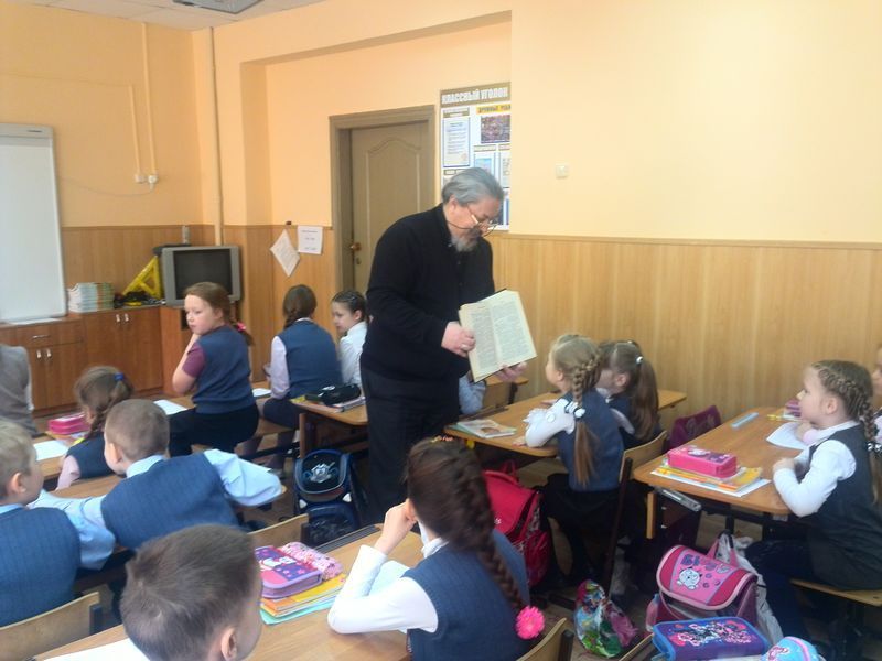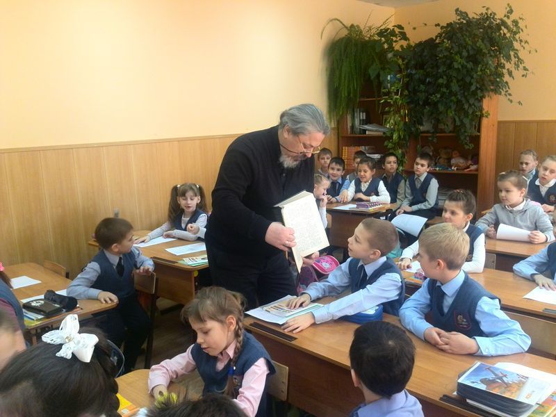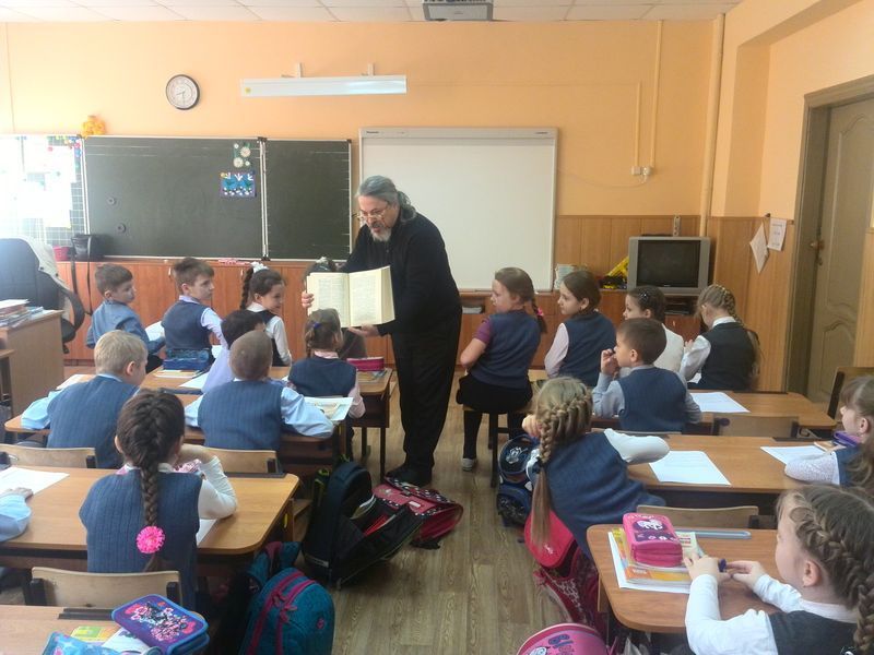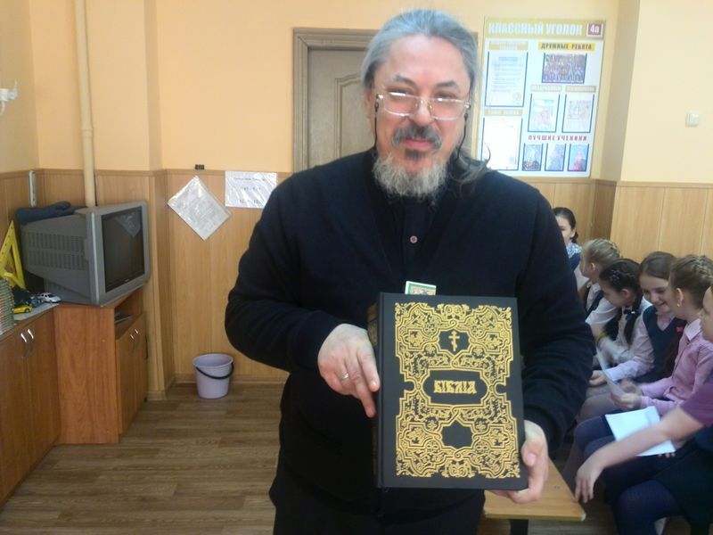 Школьники вместе попытались прочитать некоторые слова из 20 главы книги Исход и даже успели приступить к изучению заповедей, освоив первые две. Поскольку урок был посвящен предстоящему празднику Православной книги, Владимир Александрович привез с собой праздничные подарки — он вручил учителям три экземпляра Нового Завета.