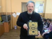 Знакомил ребят с самой главной для каждого христианина книгой помощник благочинного Восточного округа Владимир Овсянников. Владимир Александрович подошел к каждому школьнику и показал Библию, причем многие оживленно пытались прочесть церковно-славянский текст книги. Если же кому-то из ребят удавалось связать старинные буквы в слово или даже затем несколько слов - в предложение, радости юных исследователей не было конца.
