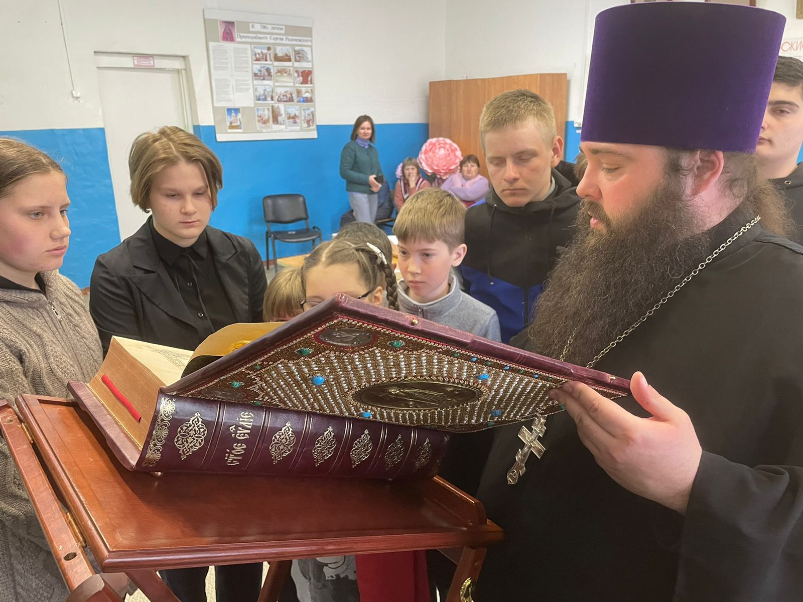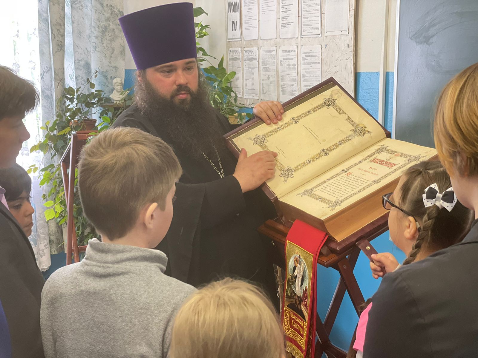 В завершение урока батюшка рассказал детям о Евангелии, Апостоле и Псалтири. Специально для этой встречи отец Павел подготовил и принес в школу книги, и ребята попробовали их почитать.