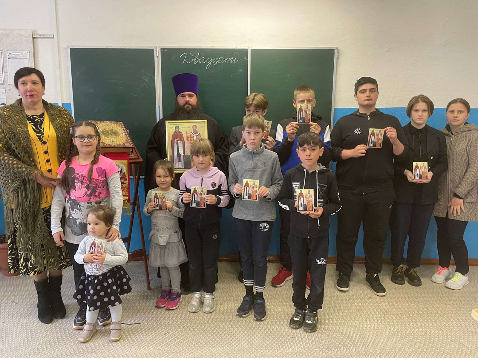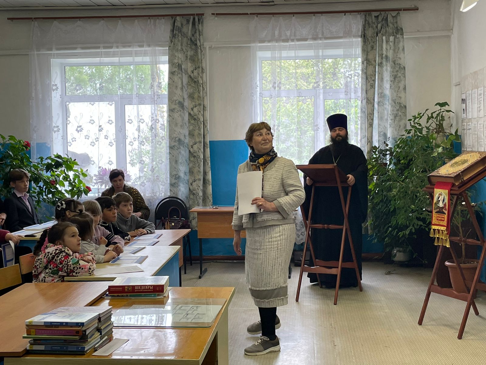 Урок начался с пения тропаря Пасхи и святым Кириллу и Мефодию. О том, как появился праздник и как его отмечают в других славянских странах, ребятам рассказала помощник настоятеля храма, заслуженный учитель Российской Федерации, лауреат премии мэра города Москвы в области образования Ольга Борисовна Калинина.