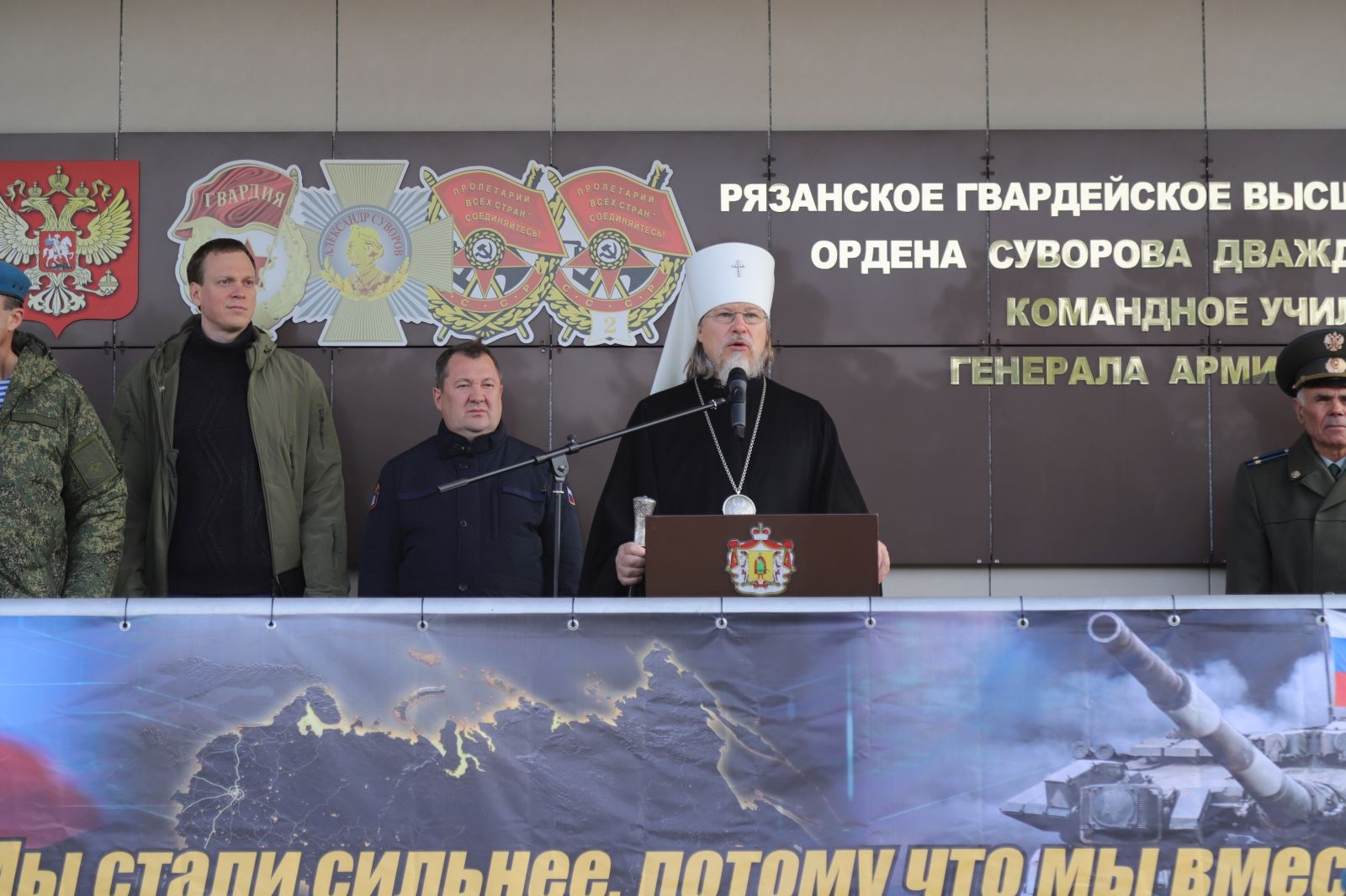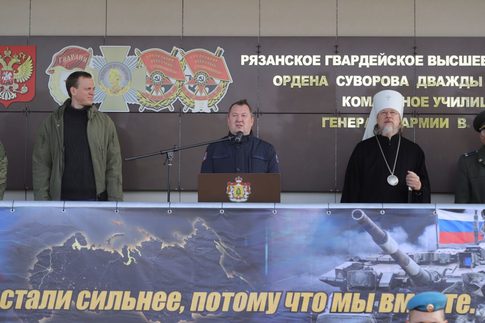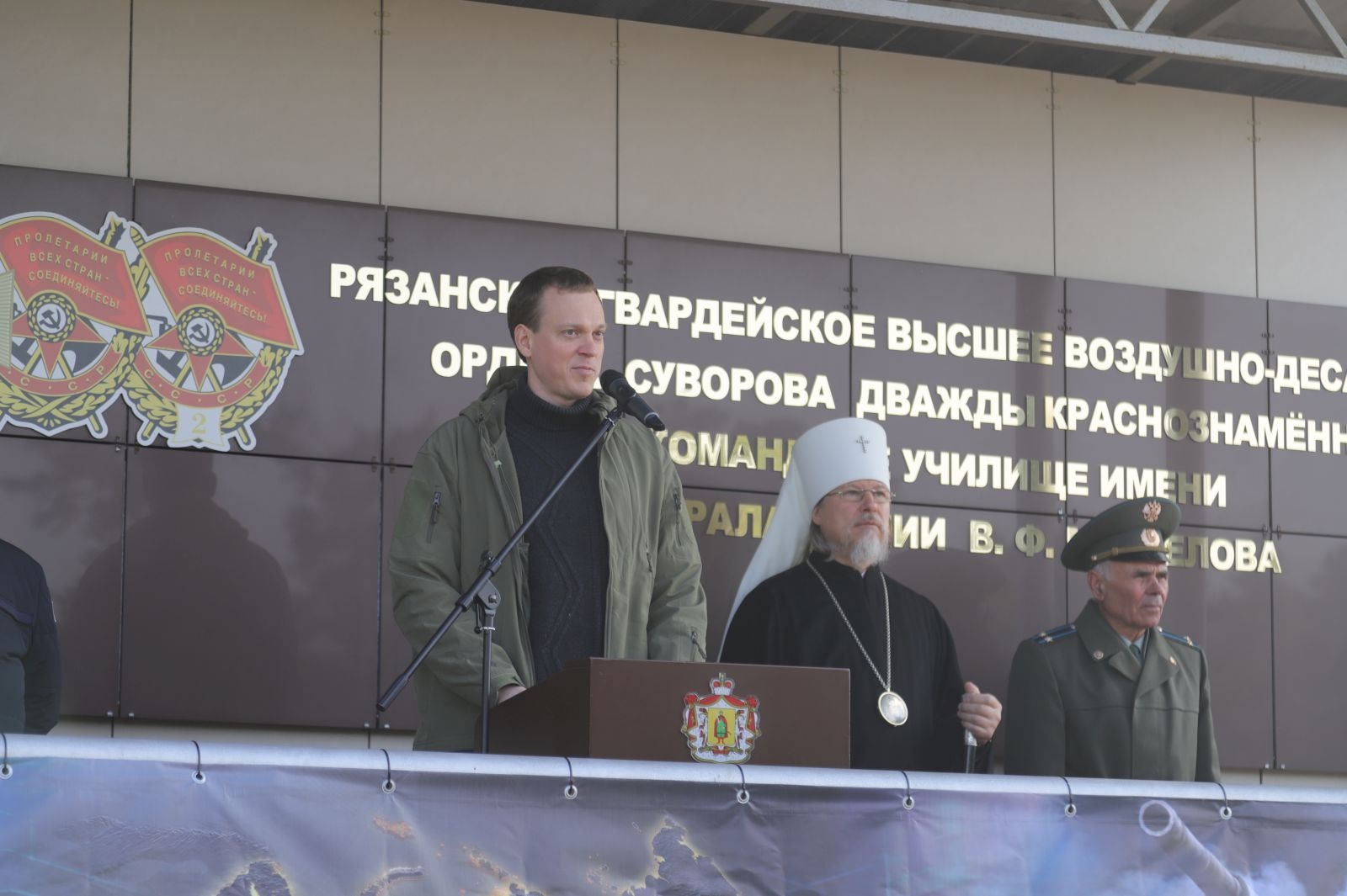 В торжественном митинге, посвященном формированию и готовности полка к выполнению задач, приняли участие начальник училища ВДВ Руслан Евкодимов, митрополит Рязанский и Михайловский Марк, заместитель председателя Рязанской областной организации Всероссийской общественной организации ветеранов (пенсионеров) войны, труда, Вооруженных сил и правоохранительных органов Николай Пешков, представители рязанского военного гарнизона, клирики Рязанской епархии.
