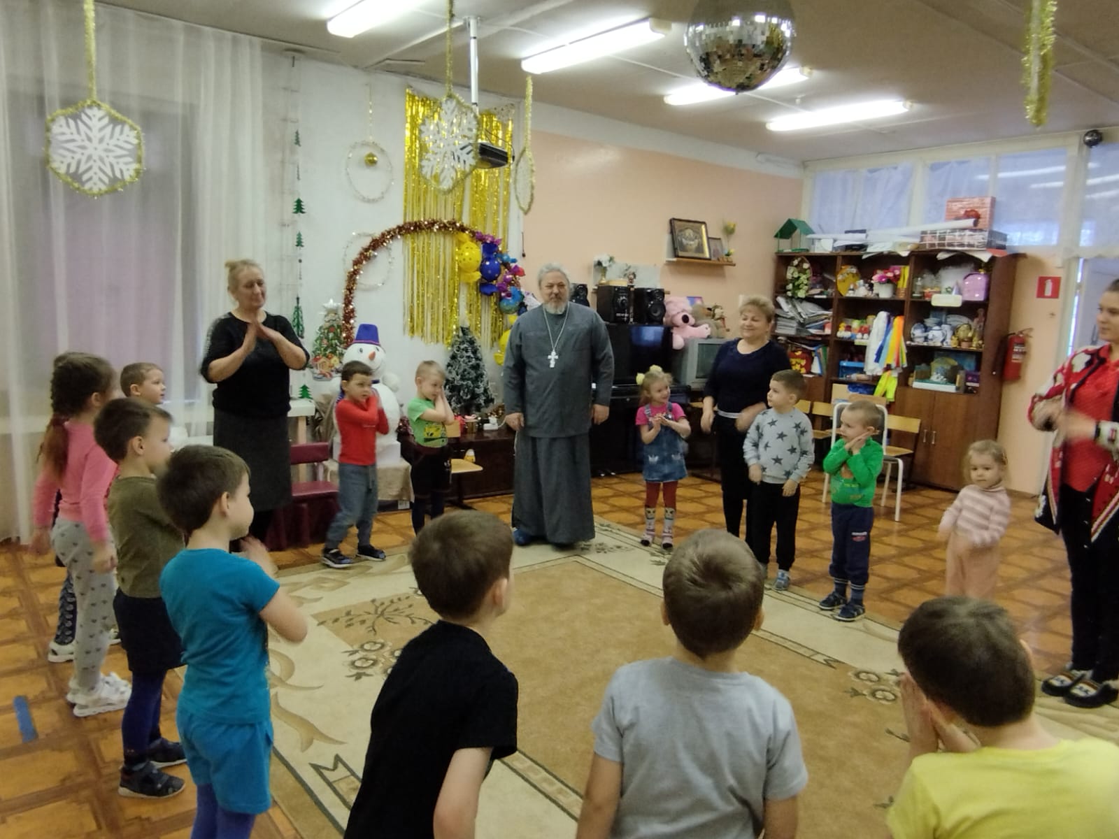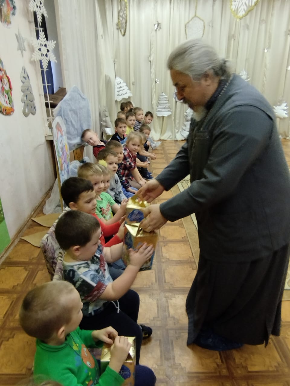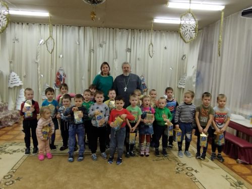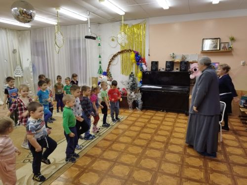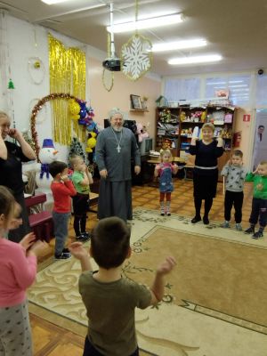 25 января к ним в гости пришел настоятель местного Покровского храма иерей Владимир Овсянников. Праздник «Зимние этюды» включал рассказ о том, как пришел на землю Спаситель, почему это было необходимо и что дало всем людям, а также о Крещении, то есть погружении, Христа в воды реки Иордан. Маленьким слушателям не сложно было воспринимать рассказ – батюшка уже давно работает с детьми и подростками и умеет рассказать просто и доходчиво о самом главном.