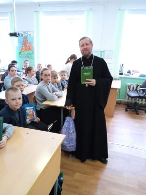 Аналогичное занятие провел настоятель храма Иверской иконы Божьей Матери в Октябрьском иерей Александр Борисов. Батюшка рассказал о православной литературе, ее истории и современных изданиях ученикам местной средней школы № 2.