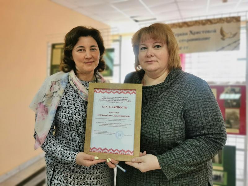 Начальник отдела культуры Михайловского района Елена Ворожеева в знак признательности за организацию выставки вручила благодарственные письма заместителю председателя Союза православных женщин, директору Рязанской епархиальной библиотеки Наталии Моисеевой и председателю историко-архивного отдела Рязанской митрополии иеромонаху Иоакиму (Заякину).