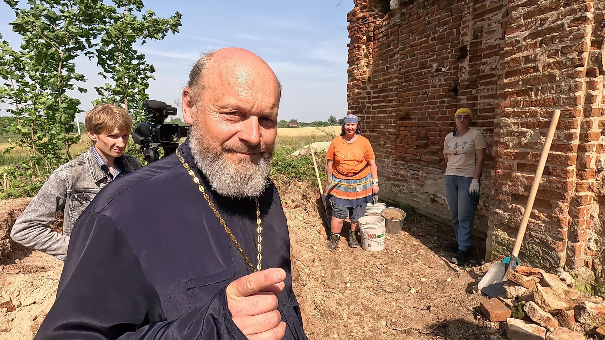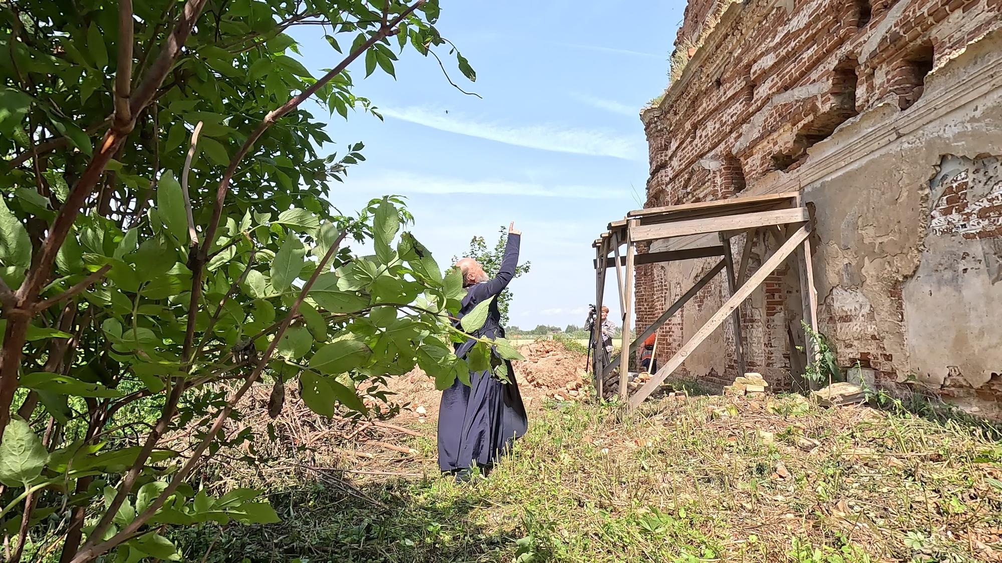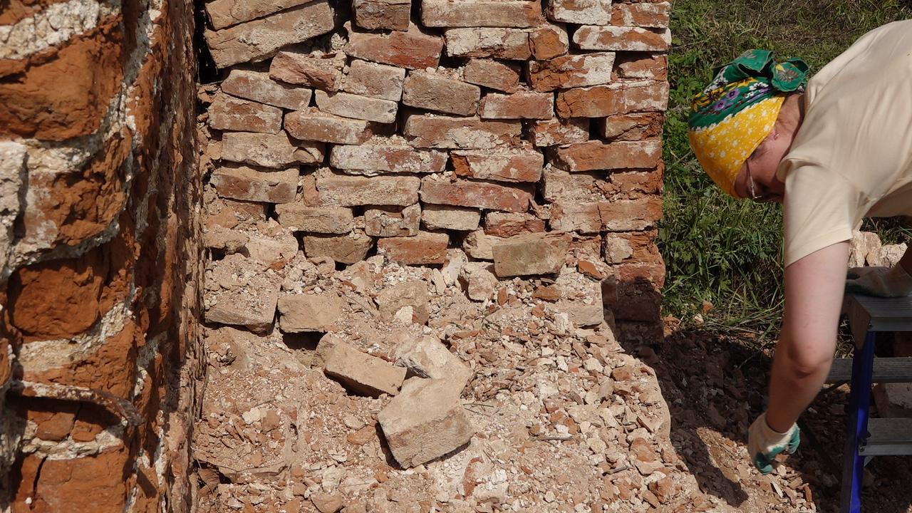 Это уже второй их приезд волонтеров в с. Аннино. В 2019 году члены «Реставроса» занимались южной стороной храма: чтобы стены просыхали, они очистили их от кирпича. В этом году они занимаются северной стороной.