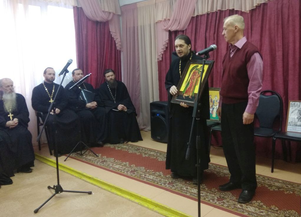 Осенью минувшего года в исправительных учреждениях Рязанской области несколько осужденных трудились над созданием картин для конкурса православной живописи «Канон». По итогам регионального этапа этого творческого конкурса одна работа отправилась дальше в Москву, а остальные совместным решением их авторов, руководства исправительных учреждений, а также помощника начальника Управления ФСИН по организации работы с верующими Николая Кутакова решено было передать в дар Геронтологическому центру им. Мальшина.