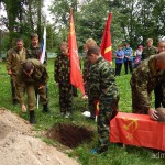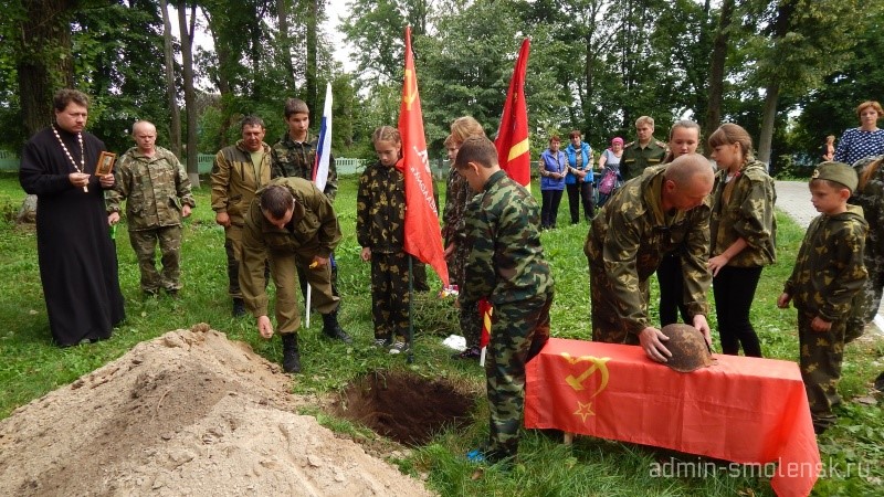 Проводить в последний путь солдата пришли глава муниципального образования «Хиславичский район» Петр Шахнов, председатель Хиславичского районного совета депутатов Светлана Костюкова, начальник отдела военного комиссариата Смоленской области по Хиславичскому району Александр Бабинцев, командир поискового отряда «Хослав» Андрей Волоцуев, ветераны Великой Отечественной войны, учащиеся Хиславичской средней школы и жители поселка.