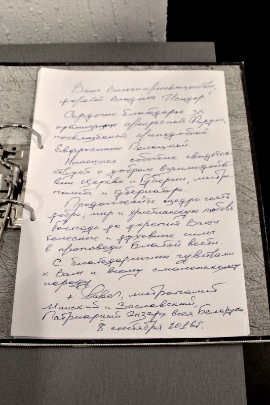 Затем в одном из выставочных залов КВЦ состоялось открытие выставки Полоцкого Спасо-Евфросиниевского монастыря «Обитель преподобной Евфросинии, игумении и княжны Полоцкой». Митрополит Павел, митрополит Исидор и Ольга Окунева, перерезав красную ленточку, объявили выставку открытой, после чего первую экскурсию для смолян провели сестры обители. Всем посетителям была подарена икона преподобной игумении Евфросинии.