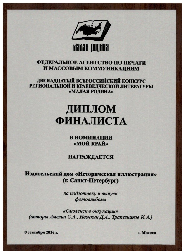 Вручение диплома финалиста состоялось в Москве 8 сентября 2016 г. Во время получения диплома И.А. Трапезников сказал членам экспертного совета слова благодарности за признание книги «Смоленск в оккупации» лауреатом конкурса. Смоленск – исконный город России, город-ключ, неоднократно стоявший на пути захватчиков, стремившихся к Москве. Не остался он в стороне от трагических событий Великой Отечественной войны. Цель альбома – показать весь трагизм ситуации, когда величественный Смоленск оказался оккупированной немцами территории. Данный альбом – один из первых опытов по освещению событий войны в провинциальных городах с помощью фотографий. И.А. Трапезников выразил надежду, что идея, осуществленная смолянами, будет поддержана краеведами нашей страны.