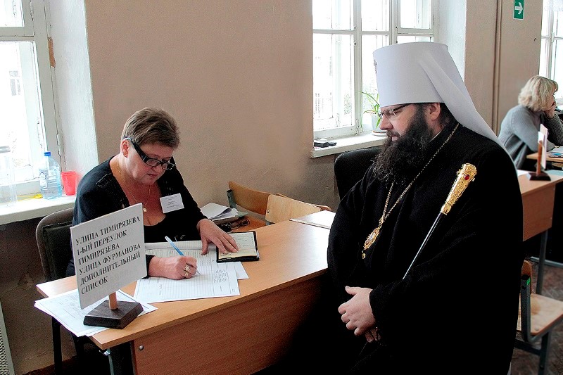 Высокопреосвященнейший Исидор, митрополит Смоленский и Рославльский, принял участие в голосовании на своем избирательном участке, размещенном в СОШ №1 города Смоленска по улице Соболева.