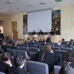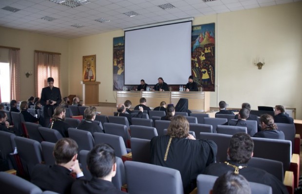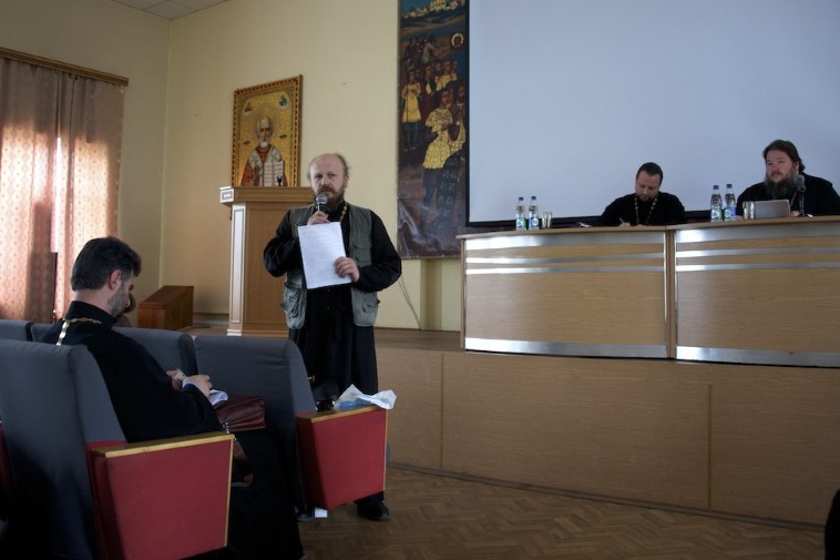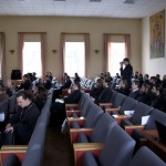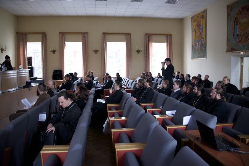 Совещание открылось в 12.00 в актовом зале Николо-Угрешской Духовной Семинарии, модератором выступил заместитель председателя Синодального миссионерского отдела игумен Серапион (Митько).