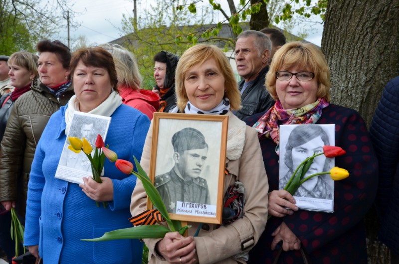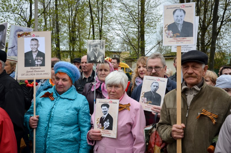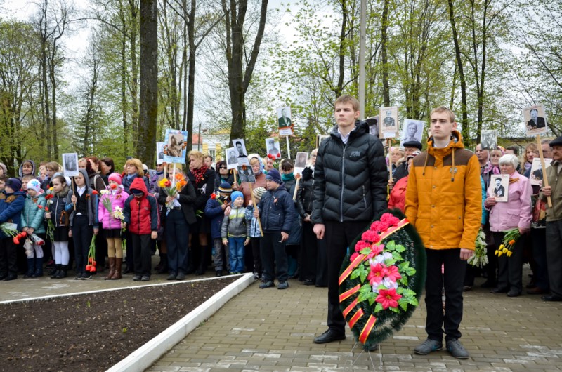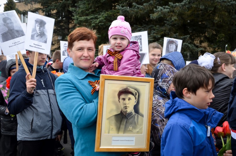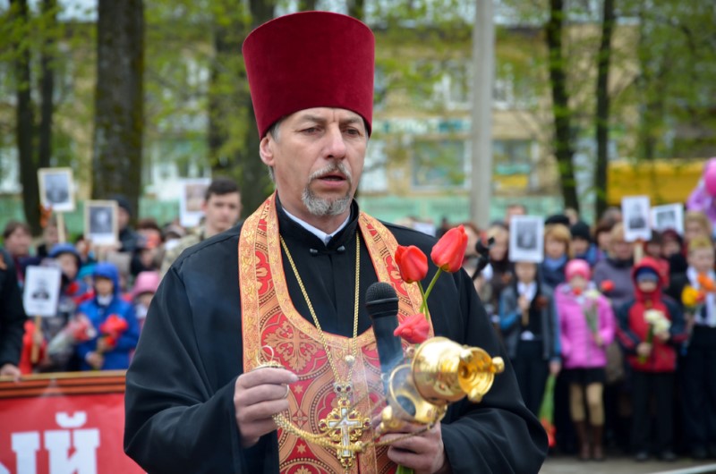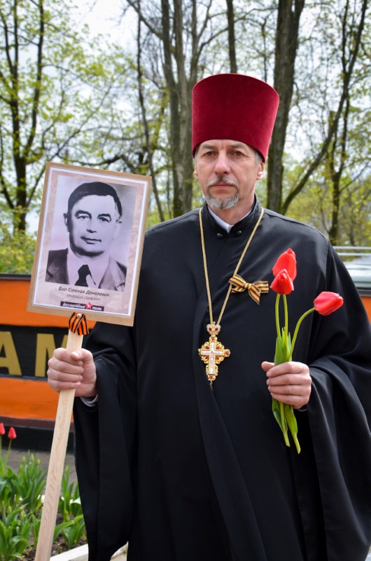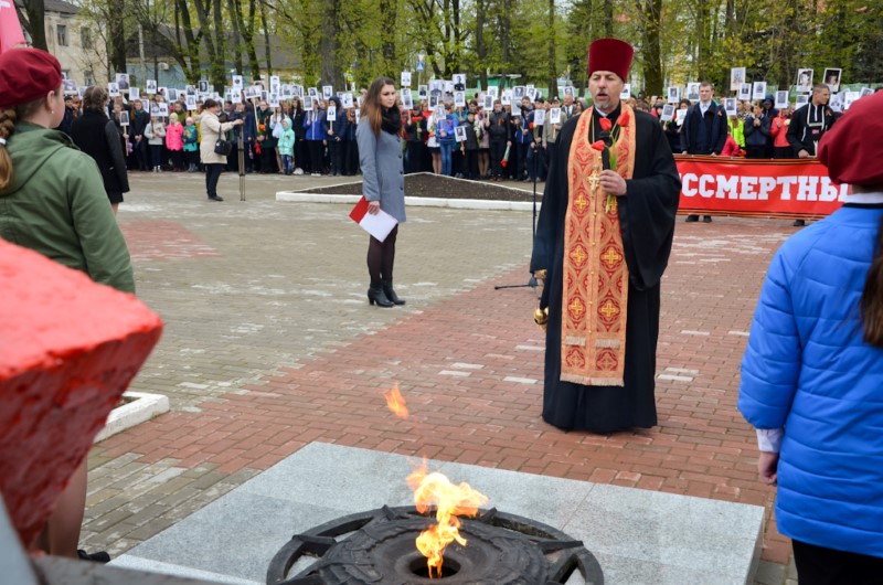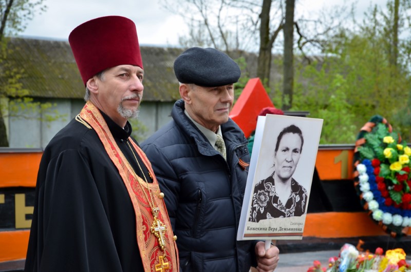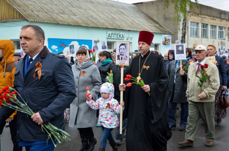 Перед торжественным митингом прошло парадное прохождение от Дома советов до Сквера Памяти участников патриотической акции «Бессмертный полк». Они с гордостью несли портреты своих отцов, матерей, дедов, бабушек, прадедов и прабабушек, благодаря которым мы празднуем годовщину Победы. К числу участников акции присоединился отец благочинный.