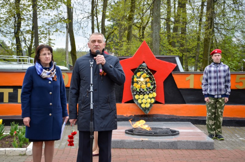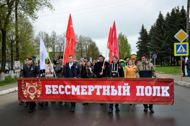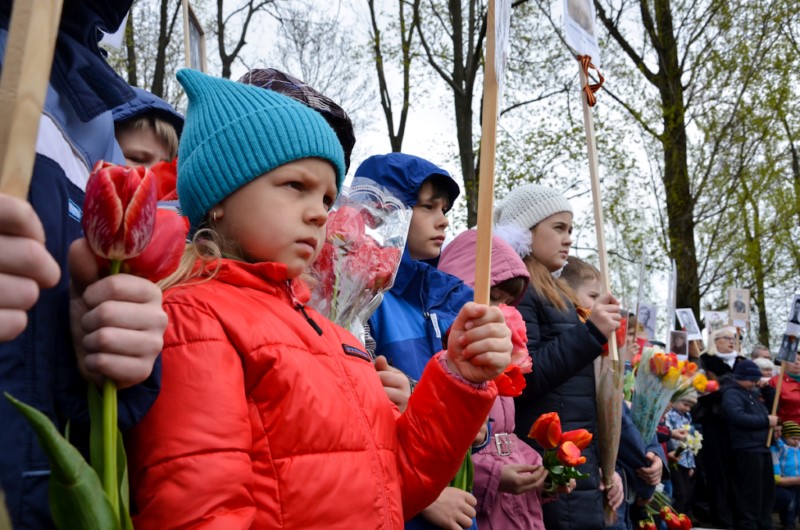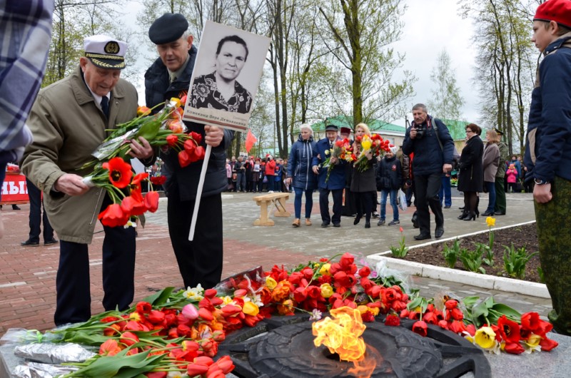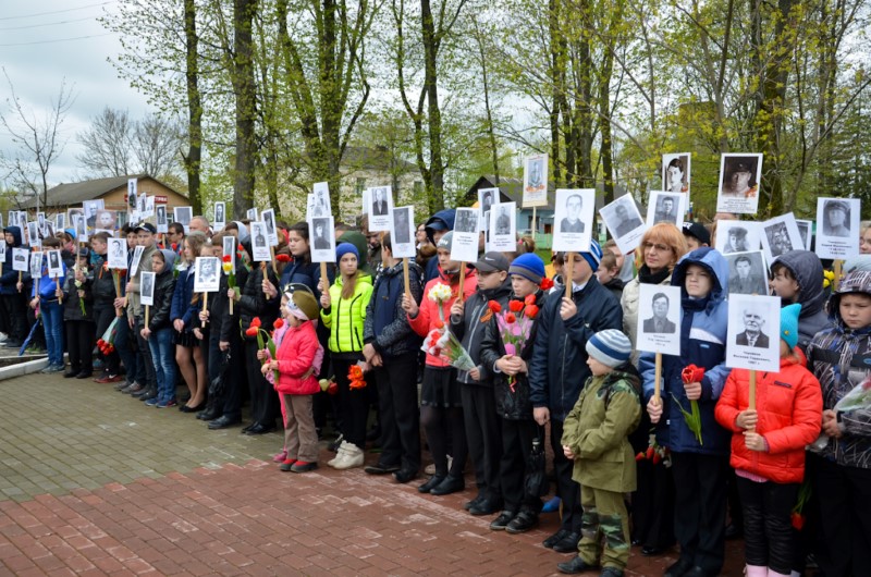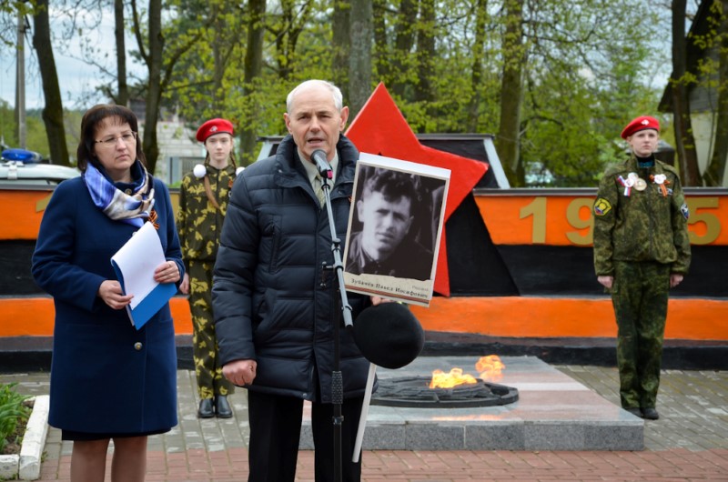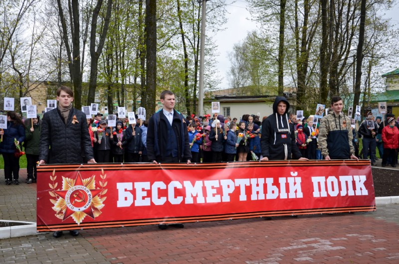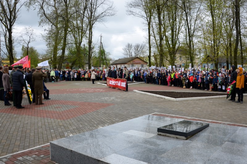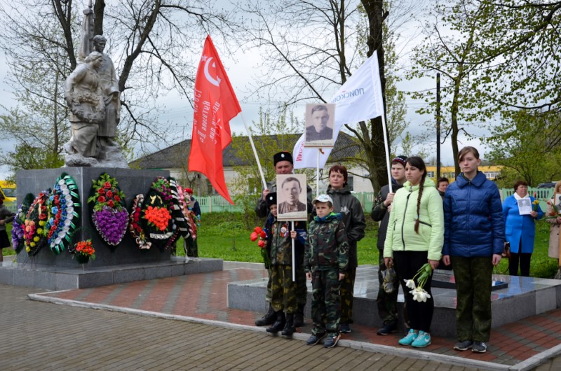 Перед торжественным митингом прошло парадное прохождение от Дома советов до Сквера Памяти участников патриотической акции «Бессмертный полк». Они с гордостью несли портреты своих отцов, матерей, дедов, бабушек, прадедов и прабабушек, благодаря которым мы празднуем годовщину Победы. К числу участников акции присоединился отец благочинный.
