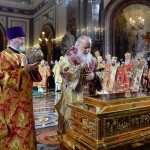 После чтения Евангелия Святейший Патриарх Кирилл приложился к мощам и обратился к собравшимся в храме с Первосвятительским словом.