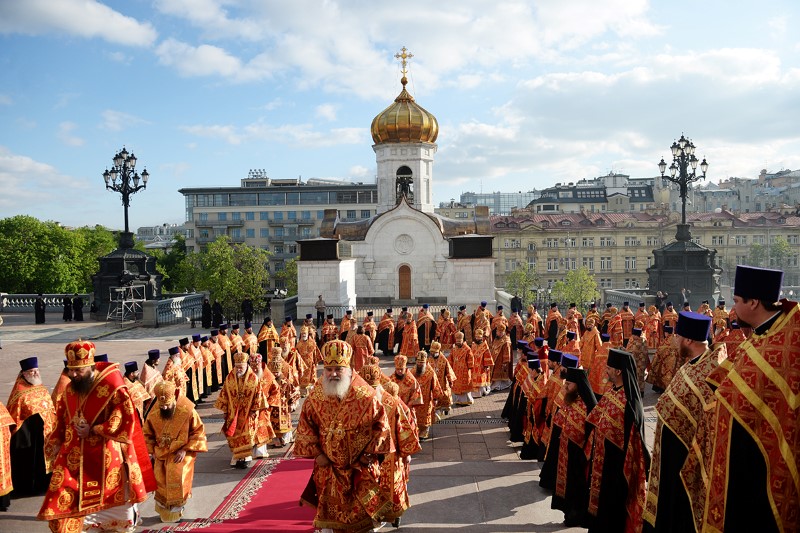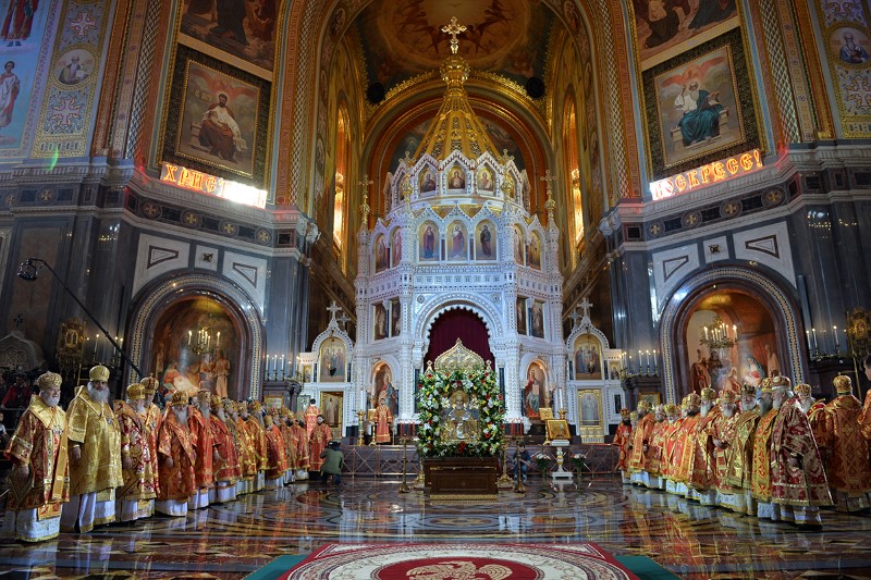 Перед полиелеем Предстоятель Русской Православной Церкви, иерархи и духовенство вышли через западные врата Храма Христа Спасителя для встречи ковчега с частью мощей святителя и чудотворца Николая. Великая святыня была доставлена в Москву спецрейсом из итальянского города Бари.