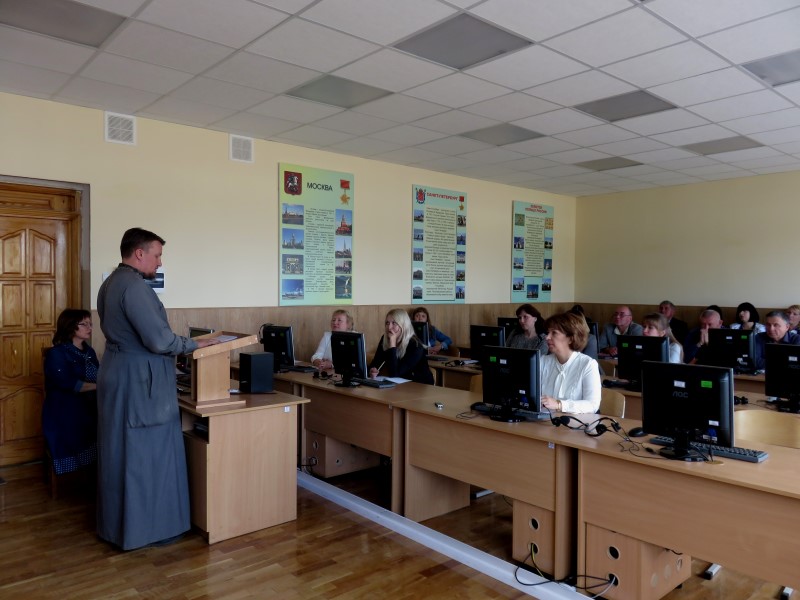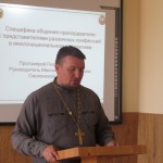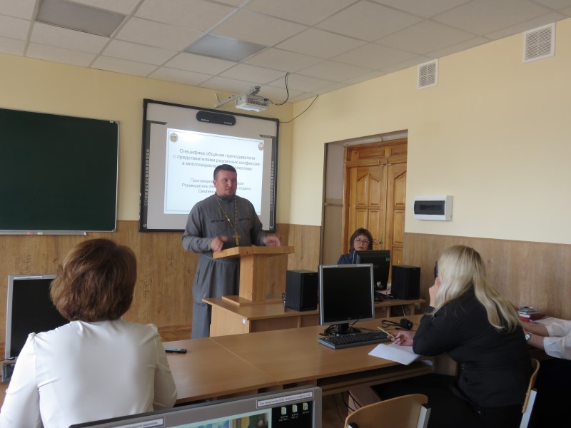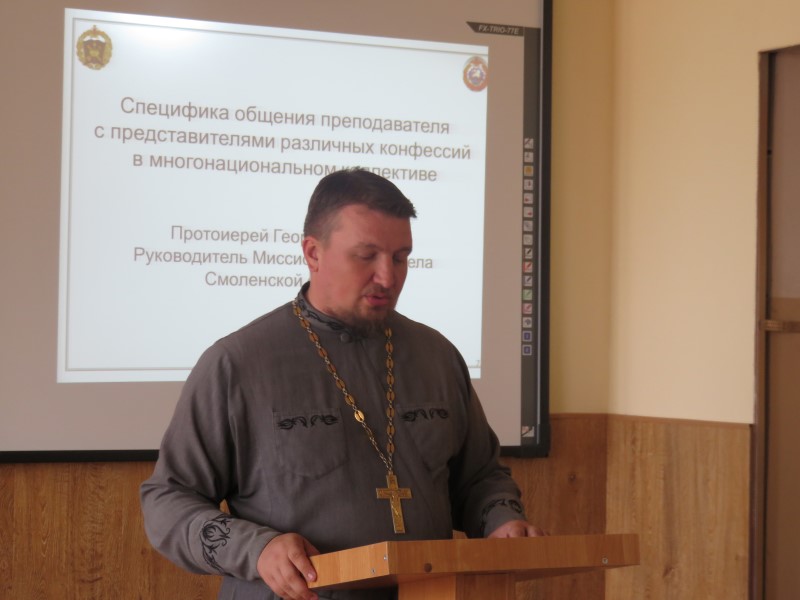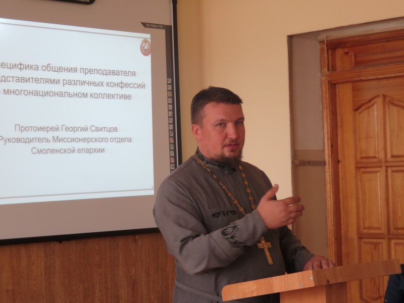 В рамках встречи протоиерей Георгий Свитцов, руководитель Миссионерского отдела Смоленской епархии, обратился к теме: «Специфика общения преподавателя с представителями различных конфессий в многонациональном коллективе».