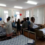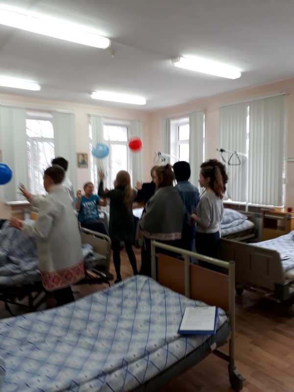 Психолог хосписа Ирина Михайловна сопровождала ребят по палатам, и они играли в разных палатах с полной самоотдачей, не обращая внимания один там человек или несколько. В заключение по сложившейся традиции была организована игра с шарами.