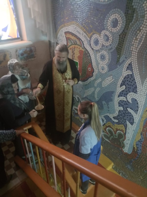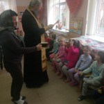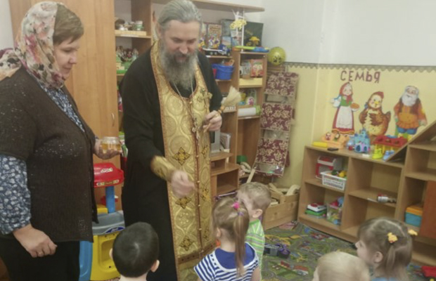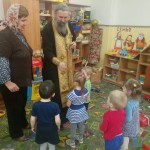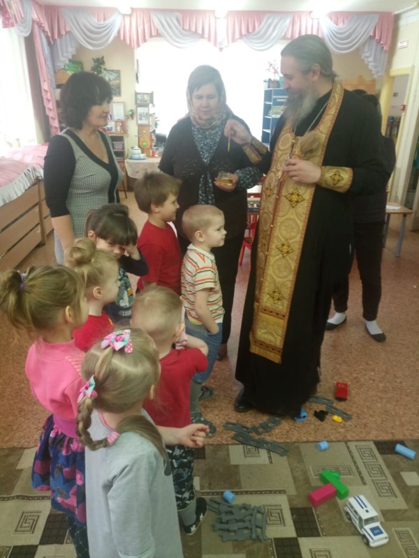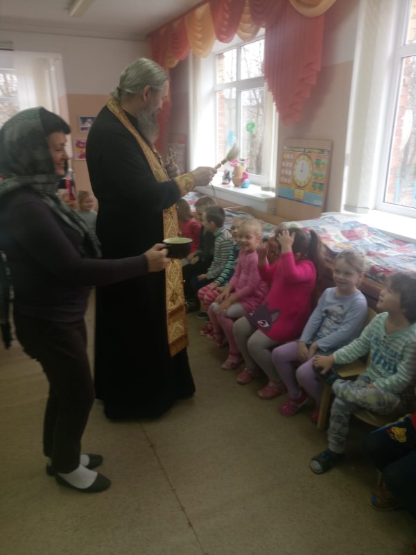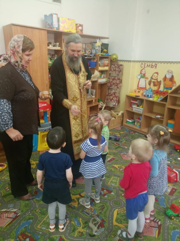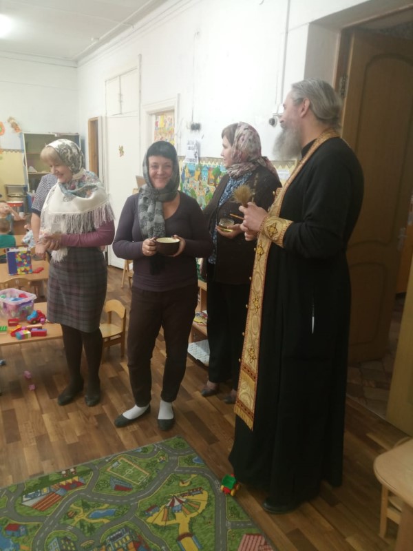 Протоиерей Павел совершил молебен и окропил святой водой все помещения детского сада. Закончив чин освящения, священник побеседовал с воспитанниками и воспитателями о непреходящих ценностях, о любви к ближним, о важности почитания родителей и уважительного отношения к старшим; пожелал всем здоровья, а коллективу успехов и сил в их важном труде. Преподнес в дар икону Божией Матери Одигитрии Смоленской и угостил ребят конфетами.