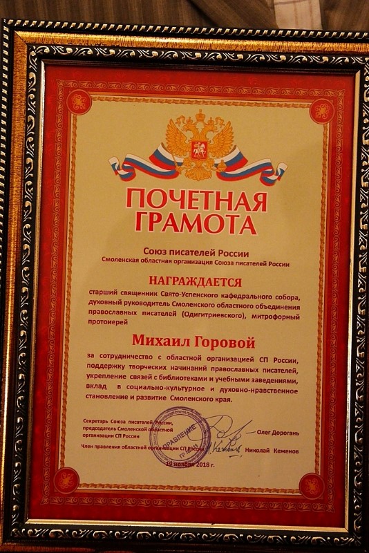 Председатель этого творческого объединения, поэт, член Союза писателей России Николай Кеженов от имени собравшихся поздравил с Днем Ангела духовного руководителя православных литераторов, старшего священника Свято-Успенского кафедрального собора протоиерея Михаила Горового и вручил ему Почетную грамоту Смоленской областной организации Союза писателей России «за сотрудничество, поддержку творческих начинаний православных писателей, укрепление связей с библиотеками и учебными заведениями, вклад в социально-культурное и духовно-нравственное становление и развитие Смоленского края».