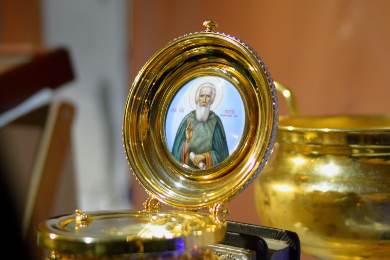 В завершение богослужения верующие с благовением приложились к святыням храма – иконе и ковчегу с частицей мощей преподобного Сергия и получили благословение в помазании освященным елеем.