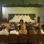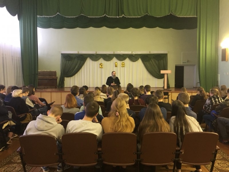 После приветствия директора школы Т.М. Новиковой протоиерей Василий выступил перед учащимися. Отец благочинный затронул темы, касающиеся многих ребят данного возраста. Учеба, взаимоотношения, дружба, любовь, жизненные цели, понятие счастья и многое другое стало предметом обсуждения.